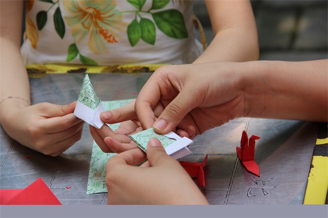 手工折纸花看似简单,步骤并不简略。小朋友们仔细观察,耐心学会了一些繁杂的步骤。看着一张张五颜六色的手工纸在小朋友灵活的手指间翻折,慢慢变成了一件件形象逼真、造型别致的手工作品,真为小朋友感到骄傲!小朋友在志愿者的帮助下也学会了千纸鹤和小船。千纸鹤,是代表对他人的祝愿,每只千纸鹤承载一份祝愿,最终成为一个愿望,志愿者手中的千纸鹤则是对小朋友最好的祝福。