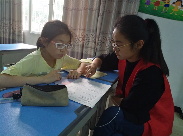 小朋友的陆续到来,志愿者们开始忙碌起来。虽然现在放学时间比五一之前延后了不少,小朋友们还是会带着作业来社区写作业。“很喜欢这些大哥哥大姐姐的讲题思路,有了他们的点拨,比我自己在家完成作业轻松了不少。”傅辛小朋友接着说,“当我来到社区看到你们,就觉得很是安心,也愿意去思考那些讨厌的数字符号了。”小朋友的一些细小的改变,都是志愿者继续坚持的动力。小朋友们的成长是志愿者们的收获。