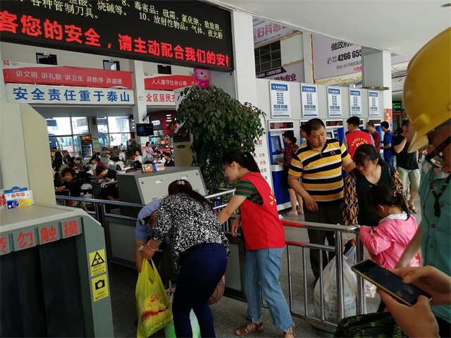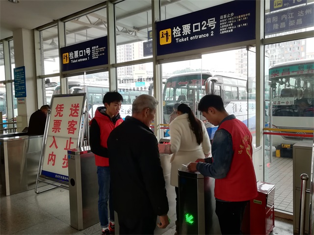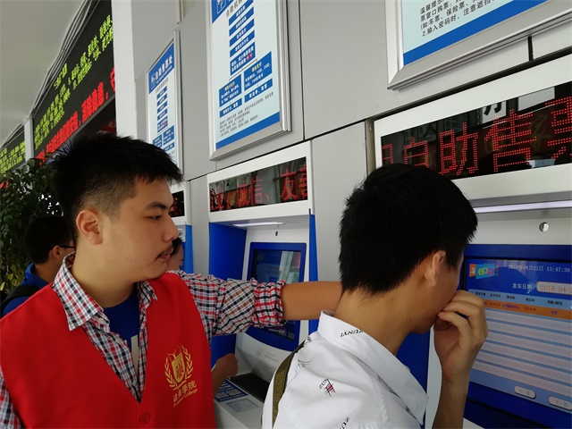 在车站,志愿者们在自动售票机处,为前来买票取票的乘客提供咨询和帮助,去切实地解决乘客的问题,为他们节约了时间,缓解她们的慌乱;志愿者在安检机旁时,目光紧盯着过往的人群,耐心地提醒人们,为确保车站的安全小包需要安检;志愿者们坚守在检票口处,帮助车站工作人员对进站人群进行检票,面对排成长队的人群,志愿者们一刻也不松懈,仔细核对身份证和车票,确保车站工作的顺利进行。