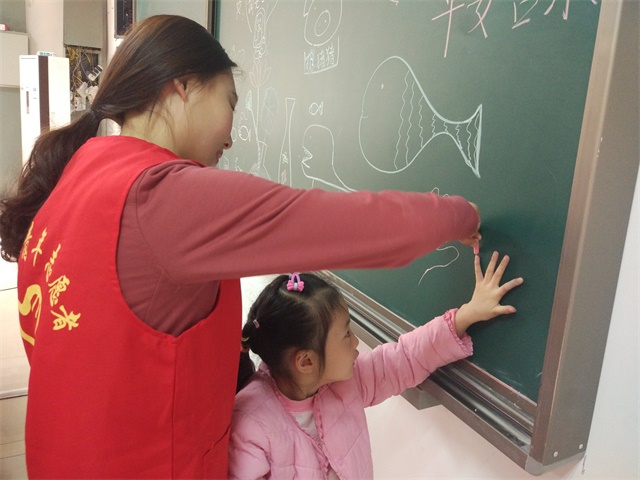 志愿者和小朋友一起在黑板上作画,欢笑声在教室里回荡。志愿者用他们的热心和真诚赢得了孩子的信任,孩子们的爷爷奶奶年龄日益增大,精力有限,无法给他们过多的关心。志愿者们通过聊天、做游戏的方式,让孩子们享受快乐、感受到被爱,并且学会分享。