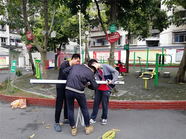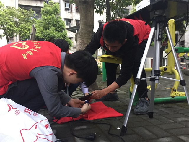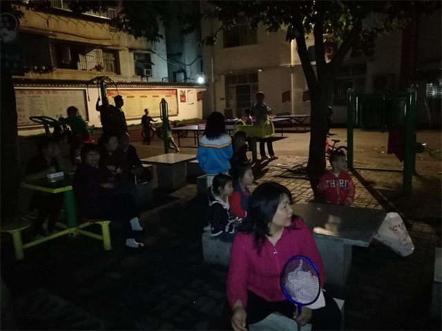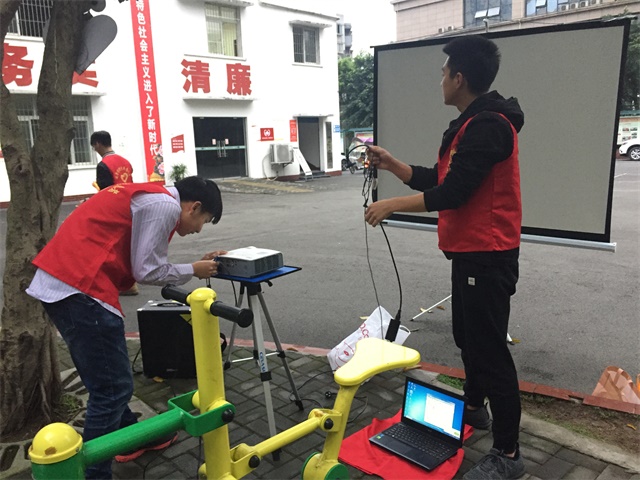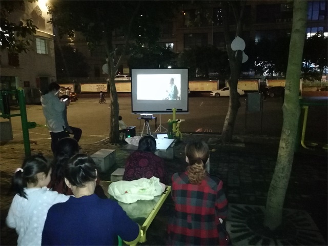 到达社区后,工作人员带志愿者去到设备存放室,找齐播放设备后,小心翼翼地搬到社区中央的广场上。大多志愿者是第一次来放映电影,不熟悉设备的连接和使用。经过志愿者的一番摸索和社区工作人员的耐心指导,电影准时开始。