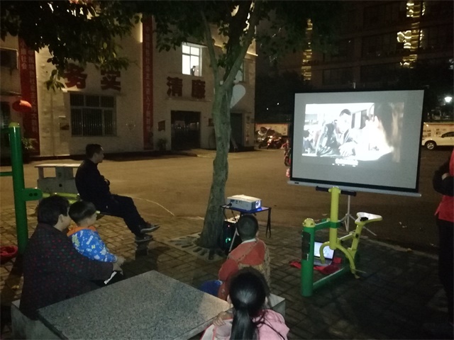前来观看的人逐渐多了起来,志愿者没有放松,细心地维护放映现场的秩序,同时注意着放映设备,保证设备的正常运行和安全。在影片情节步入高潮时,屏住呼吸,目光集中在银幕上。观影的人群里,不时发出一阵阵欢快的笑声。看着观影居民的笑脸,志愿者们感到满足。