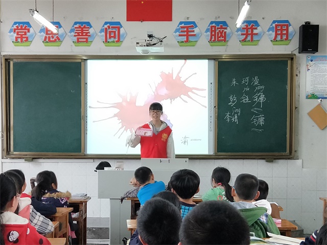 小学校园,是一个人成长发展的起点。走进校园,迎面扑来青春的气息。志愿者们在周围小朋友的注视下,怀揣着期待来到了五年级二班。上课铃声响起,小朋友积极主动地帮着志愿者打开了多媒体播放展台,志愿者们自我介绍完毕后,在黑板上写下了自己的名字。