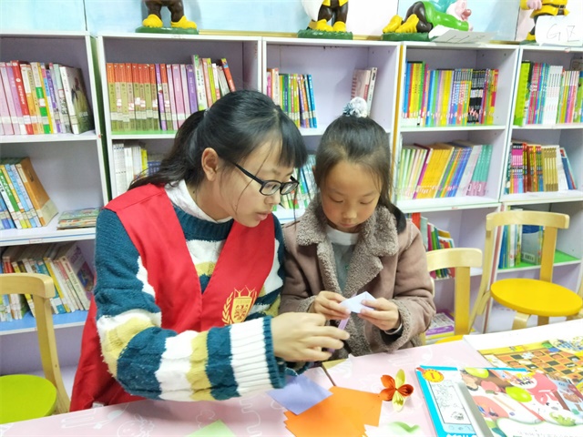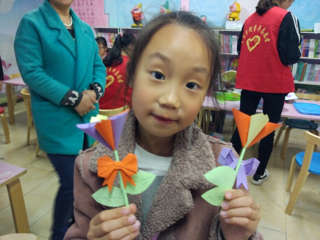 在阅读休息时,志愿者组织小朋友们学习剪纸艺术。“哇,一张纸竟然能剪出这些美丽的图案!”小朋友们们看到各式各样剪纸惊叹了起来。志愿者们拿出了事先准备好的材料与工具,小朋友们在志愿者的手把手的指导下,认真的学习。不一会儿,一个小朋友稚嫩的双手上已经捧起了一朵花,另一个小朋友也做好了漂亮的蝴蝶结。孩子们将剪好的作品一份留给父母,一份送给了志愿者们。小朋友们这份用心的爱和珍贵的感恩,是在场的志愿者的感动收获,她们学会的知识与分享,是志愿活动最大的意义所在了。