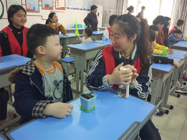 伴着清晨的阳光,经过半小时的车程到达了江亭路社区。志愿者拿起事先准备好的盆栽,在社区工作人员的带领下开始了活动。志愿者一进门,小朋友们便一起看向了盆栽,脸上充满期待。志愿们和小朋友们并肩坐下,轻快聊天。