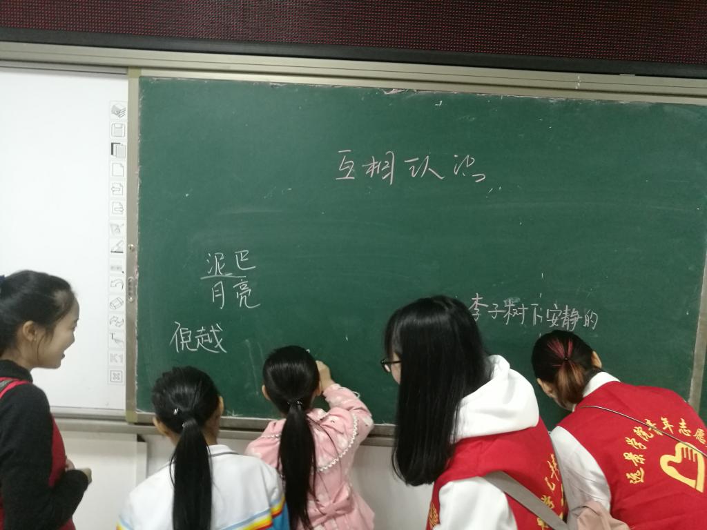 人常言:“相遇就是一种缘分。”志愿者们对这次的相遇充满着期待。初次和社区的小朋友们见面,彼此陌生,面面相觑。支队长提议,把自己的名字组词,以新奇的方式相互作自我介绍。志愿者与小朋友起身围在黑板面前写字组词。大家兴致勃勃,在融洽的交谈中,渐渐熟悉起来。