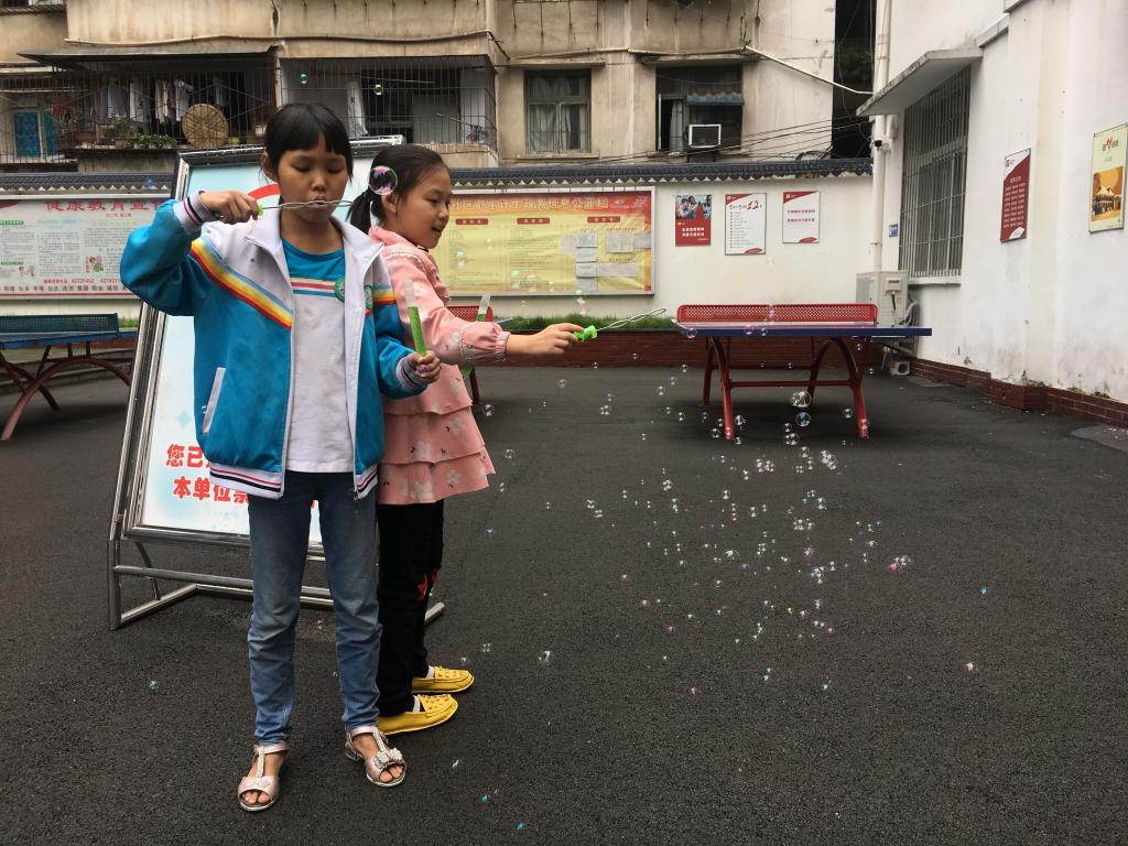 雨后初晴,社区的地不再湿滑。志愿者们将自己制作的泡泡水递给小朋友们,笑容绽放在一张张稚嫩的脸上。她们欢快地吹着泡泡。看着一串串的泡泡在天空中飘动,像五彩斑斓的小精灵在空中跳舞,小朋友们在泡泡中旋转。儿时的小玩具,勾起了志愿者内心的记忆,迫不及待地加入了这个充满童心的游戏当中。