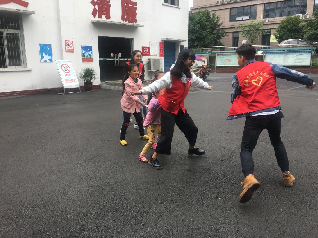 小朋友很喜欢玩游戏,尤其是“瞎子摸鱼”和“老鹰捉小鸡”,大家分工扮演好各自的角色,开始了两轮轮紧张又刺激的游戏。第一轮的时候,志愿者蒙住了自己的眼睛,小心翼翼又笨拙地移动着,小朋友们就笑嘻嘻地跑开。第二轮的时候,“鸡妈妈”将小朋友们保护在身后,小朋友们就边笑边转圈圈躲避,社区里充满了欢声笑语。