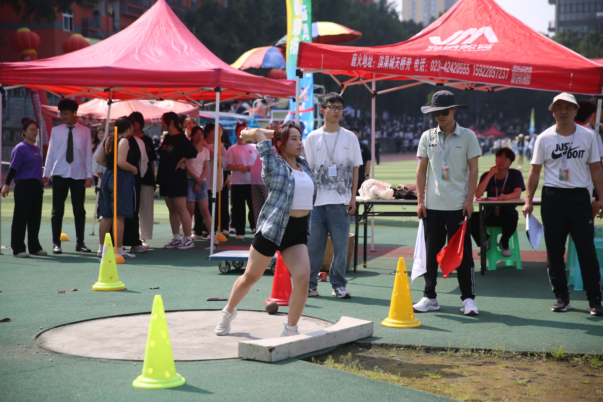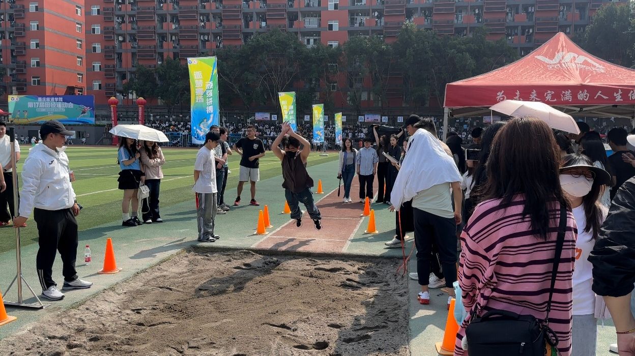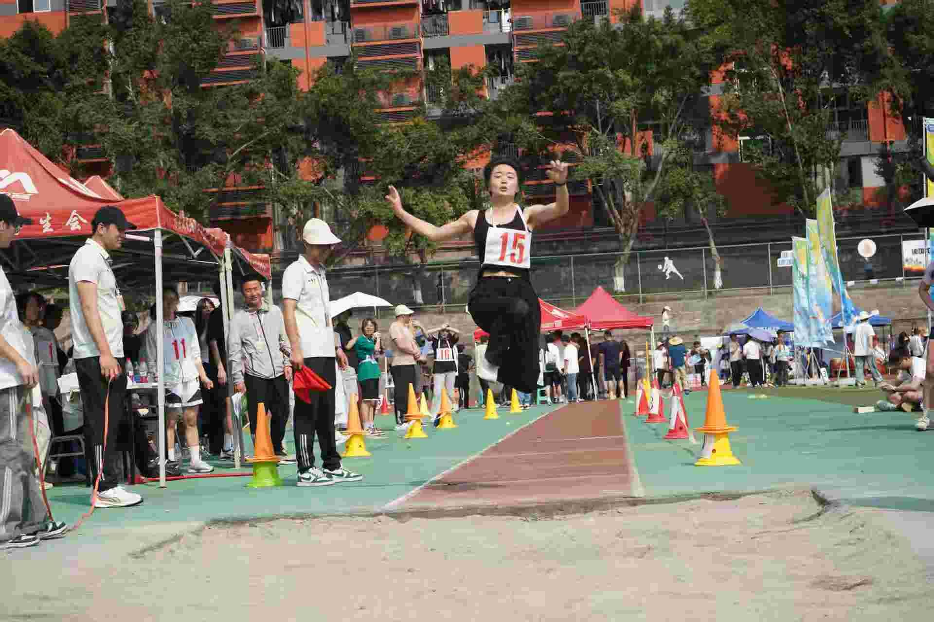 跳远赛场上,运动员们如同展翅翱翔的雄鹰。他们在助跑阶段全力加速,步伐稳健而有力,每一步都凝聚着力量与速度。起跳瞬间,他们如同弹簧般弹起,身体在空中划出一道优美的弧线,展现出惊人的爆发力和协调性。落地时,沙坑中溅起的沙尘见证了他们的努力。他们的表现赢得了观众们的阵阵掌声,也展现了远景学子的灵动与力量。