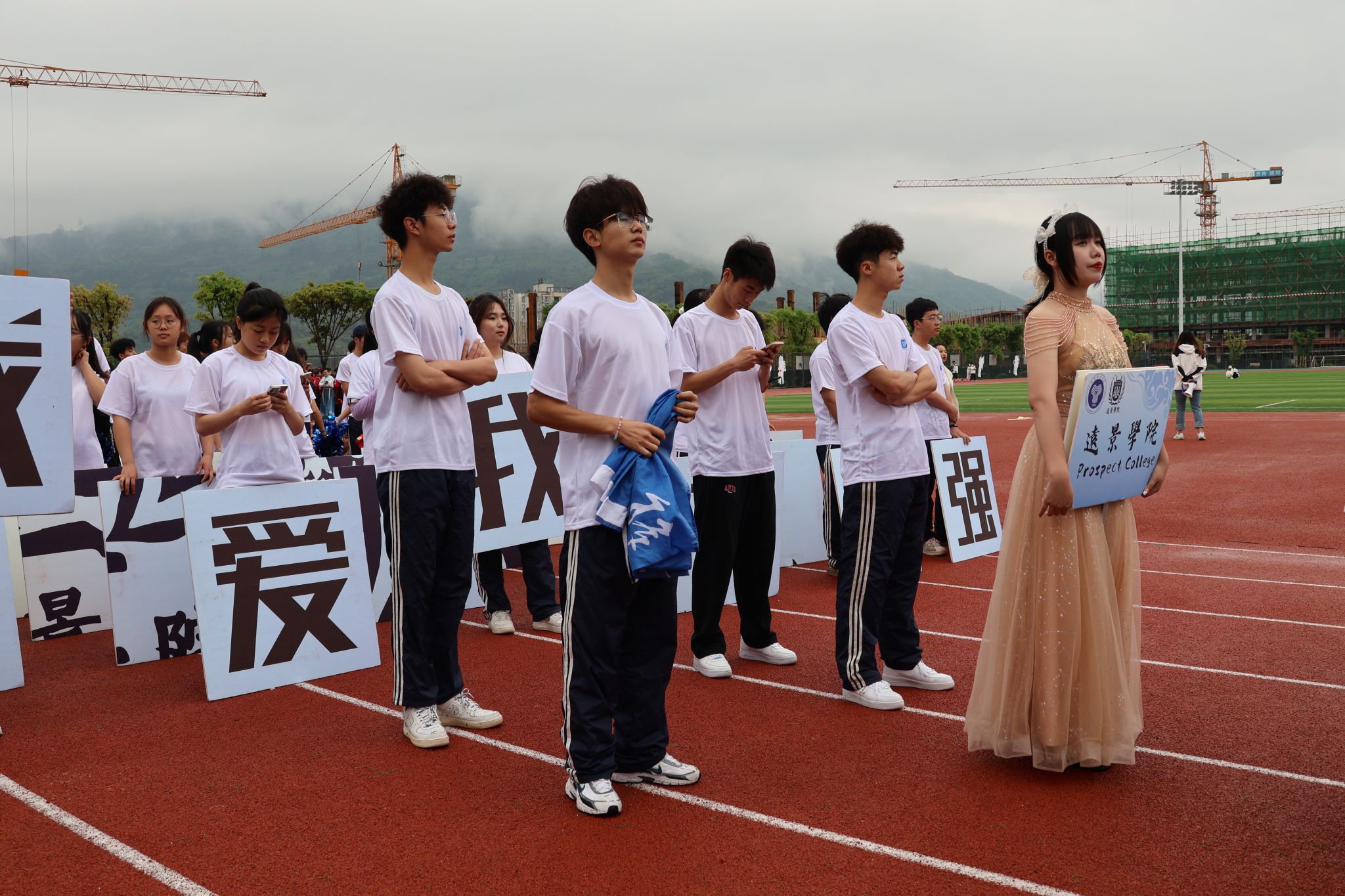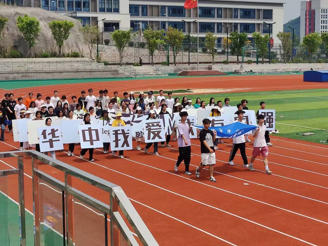 “感受移通变化,力践双院育人。开发互异才华,提升国际视野。今我远景少年,明日社会英才!”一条条横幅交织穿插,一个个字交错重叠,一声声口号鼓舞人心,远景学子在色彩流动的横幅中展示着学院育人特色,横幅在微风中抖动飘起,口号在运动场上响彻云霄,