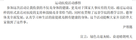 本次参与活动的同学,每人还需提供一条运动战“疫”宣言及简要感悟。为的是使同学们可以在家中运动的同时,以一种乐观的心情面对疫情。当我们身处家中时,其实每个人都在奉献自己的力量,我们相信,等疫情过后,同学们的身体健康和心理健康都会有新的变化和进步。