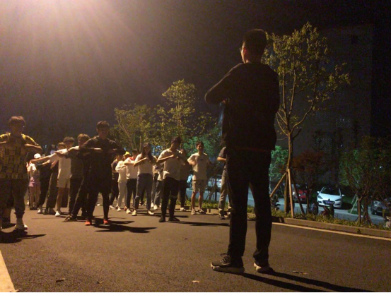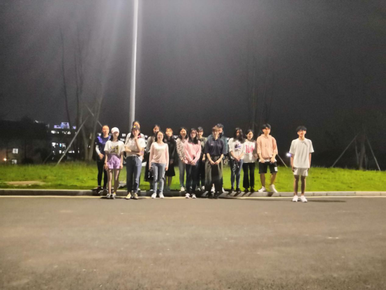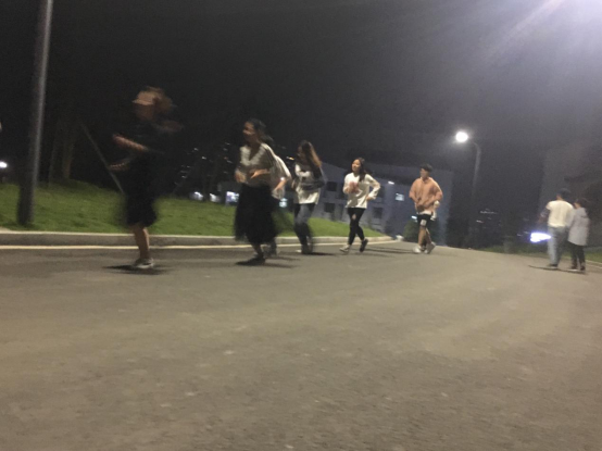 晚上九点整,活动正式开始。跑步方队随着体协工作人员的一声哨响,宛如一条浩荡的长龙,轩昂前进。为了让队伍更加整齐,体协的工作人员构成了方队的领跑和尾队。方队中的成员迈着错落有致的脚步,穿梭在D区的公路上。队伍中同学们相互鼓励,公路两旁的学生也为他们侧目。