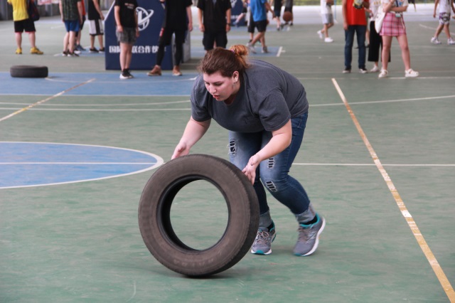 完成第三关后,他们开始最后一关的冲刺“轮胎赛跑”,向前翻滚的轮胎像是一个听话的孩子,奔向队友的面前,最后一名队友完成接力以后,活动结束了。