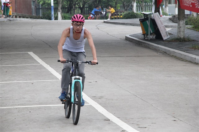 本次的比赛设有竞技组,体验组和铁三角三个比赛类别。首先进行的是游泳的比赛,比赛开始之前选手们为了适应比赛场地,早早来到了C区游泳池有条不紊地作者热身活动,随着裁判员一声哨响,各参赛队的队员纷纷跃入水中,平静的泳池瞬间变得水花飞溅,选手们不停地换气,打水。此时的泳池仿佛变成了战场。在游完400米的赛道后,选手们没有一丝的时间休息,马上飞奔着前往下一个比赛项目自行车的比赛场地。