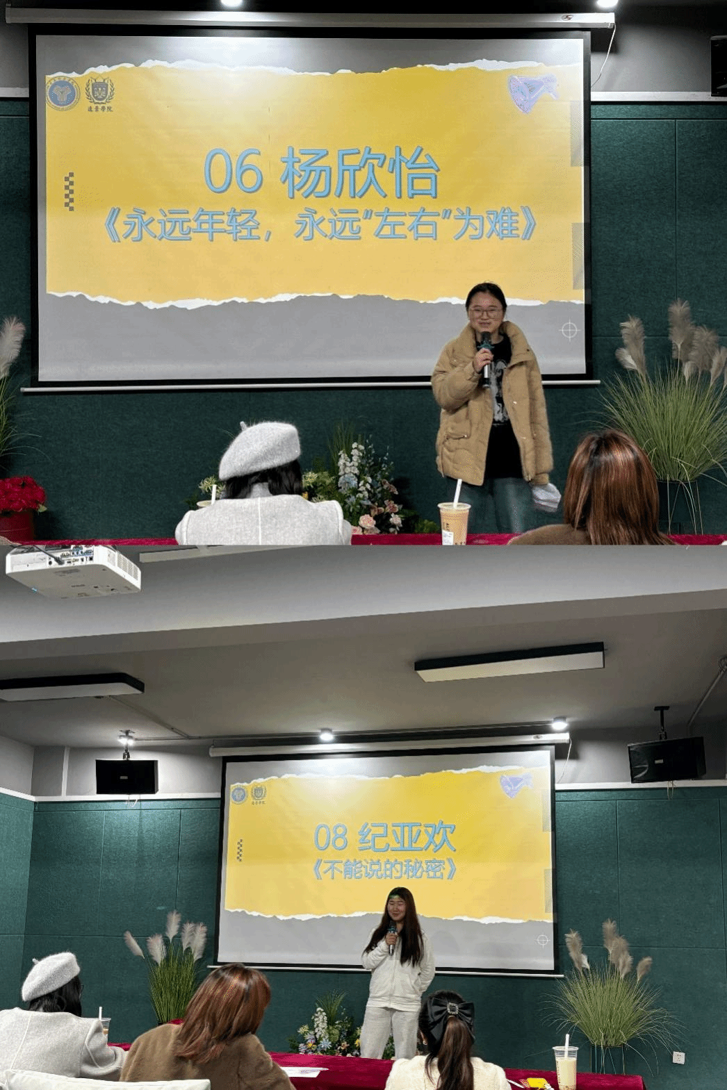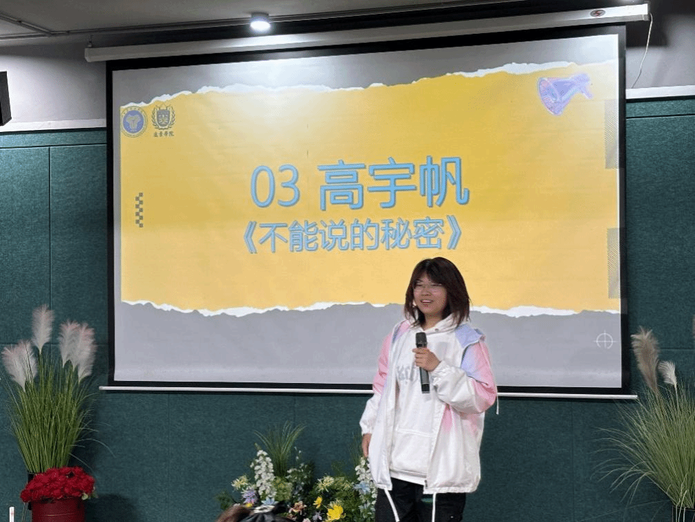 其中,黄冠越同学带来《t脱掉长衫吧》内容丰富,用生动的语言逗得大家哈哈大笑,高宇帆同学以自己旅游中的趣事为主题,她用生动的语言和夸张的表情,将一场“乌龙”事件演绎得妙趣横生,引得全场笑声连连。黄榆涵同学则聚焦现代年轻人的生活状态,以“永远年轻,永远左右为难”为主题,吐槽了当代年轻人在学业、生活、情感中的种种纠结与无奈。