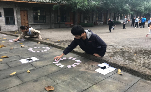第一个游戏是在菩提书院内进行的密码解析。即要求所有团队成员每人只有一次机会,按顺序翻开由同一花色组成的从A~K的扑克牌,队长在赛前带领团队制定挑战方案。为了完成挑战任务,每个团队都使出浑身解数,每队队长都勇敢的担当起队长的职责,出谋划策、任务分工、组织协调等等。最终,三队以五分十秒的好成绩率先完成了比赛,冲向下一个任务点。其他三组的同学也默契配合、紧跟进度的完成了第一个游戏任务。在这个游戏中队长当担起了他们的责任,组员们配合着队长的协调工作,也一起出谋划策,最后以很快的速度找到了窍门,完成了比赛。
