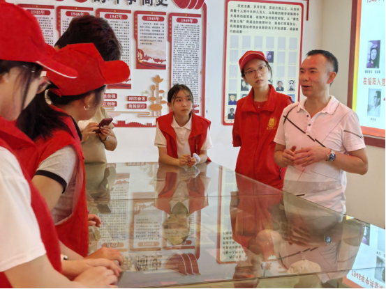 图为纪念馆志愿者为团队成员讲述革命英雄温凯延的故事