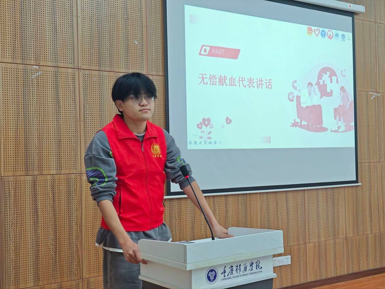随后,合川中心血站团支书谭贤成带来干货满满的专题宣讲,从献血全流程的安全保障体系展开,详细介绍献血前的健康筛查标准、采血过程中的无菌操作规范及献血后的护理要点。针对学子们普遍关注的“献血是否影响健康”“流程是否复杂”等核心疑问,谭贤成书记结合最新医学研究数据逐一解答,明确指出健康成年人定期献血不仅不会损害身体,反而能促进新陈代谢、降低血液黏稠度。同时,他还对无偿献血者的权益保障政策进行解读,包括用血报销、健康体检等福利,让在场学子对无偿献血拥有更全面且科学的认知。