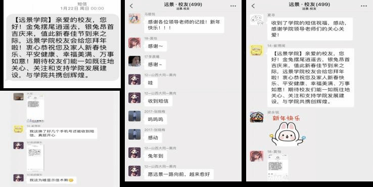 远景学院一直以来致力于为校友提供更加温馨的体验,不断增进校友与学院的情感,在2022年终岁尾之际,学院在大年初一零点整给全体校友发送跨年祝福短信,给予校友及家人最诚挚的问候,温暖的问候和祝愿,承载了学院的时时牵挂。校友们在收到春节祝福短信后,每个人都感觉心里暖暖的,纷纷在校友群内表达着感谢,并希望远景学院一年比一年更辉煌。