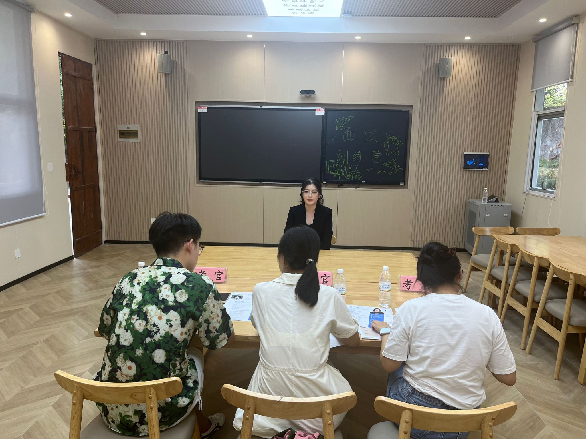 本次活动的核心是职场能力提升,主要形式是常见的结构化面试。在面试环节,考生们依次进入面试间,通过自我介绍和考官问答的方式,与评委老师们进行了深入的交流。陈思、余洋、陈颖三位老师凭借自身丰富的职场经验,为学生提供了诸多实用的建议。他们帮助学生调整心态,树立信心,这对于即将步入职场的学生们来说,是一笔宝贵的财富。