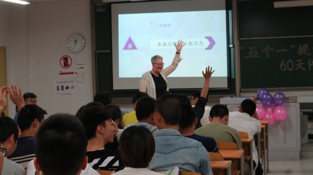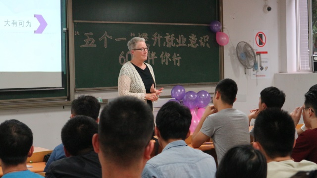 远景学院院长Gwen Bennett饶有兴致的为同学们分享了她的工作经历。她讲到她从第一次工作到现在,已经从事了几十份不同的工作。每一次不同的工作都使她更加清晰的知道自己想要从事什么样的工作。同时,她也告诉同学们,要勇于探索、敢于尝试,在纷繁复杂的世界中找到自己心仪的工作。