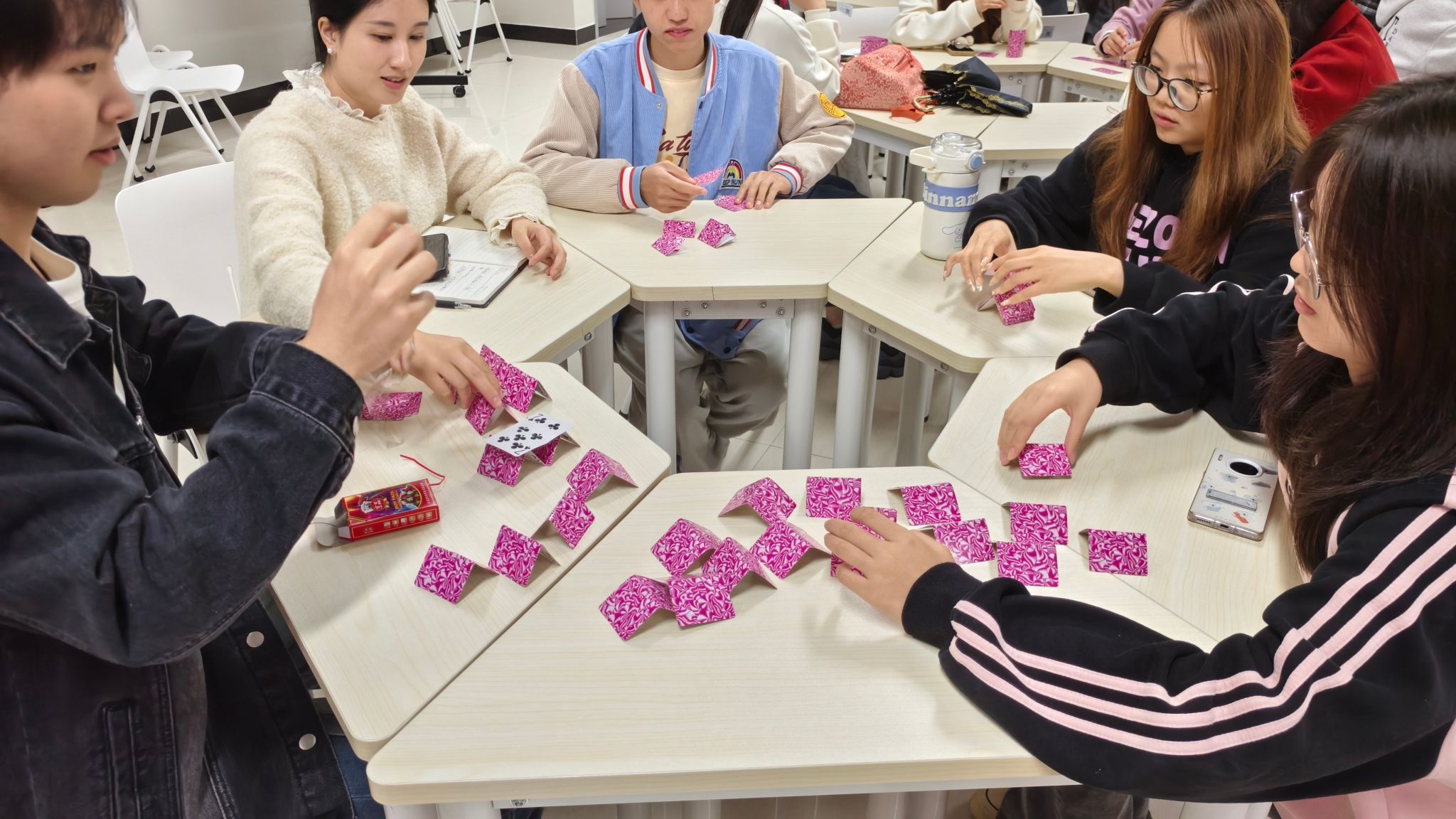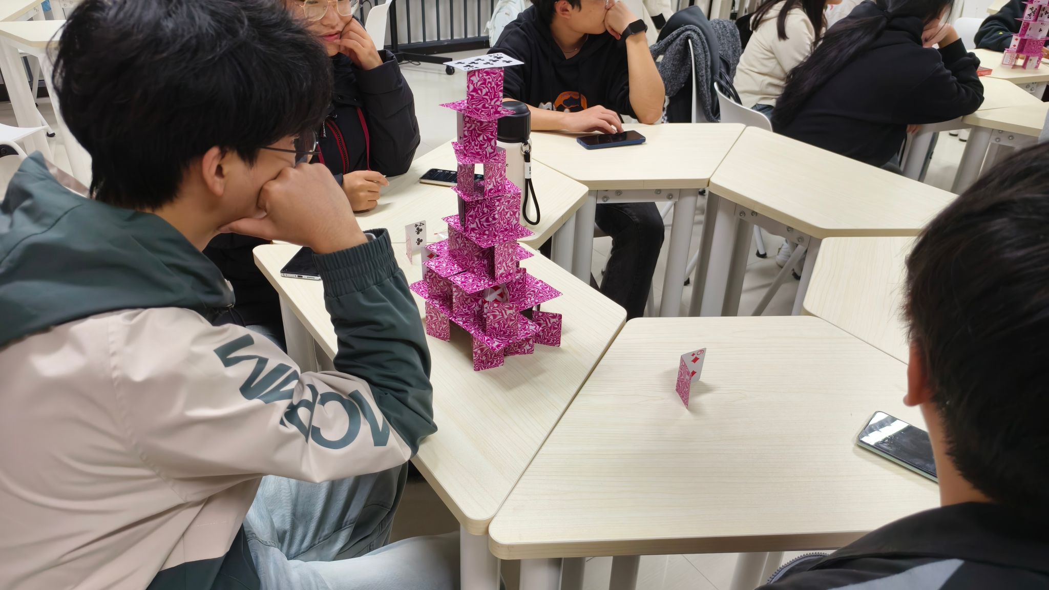 随后,张雪老师设计的“扑克牌搭桥”互动小游戏,巧妙地将团队合作与创新思维融入其中,旨在通过趣味活动促进同学们之间的相互了解和团队协作能力的提升。在游戏开始前,张雪老师耐心地向同学们介绍了游戏的具体规则和目标,强调了在有限的资源和时间内,如何通过团队的智慧和协作来达成目标。她的讲解激发了同学们的好奇心和参与欲,现场气氛迅速升温,同学们的热情被点燃,每个人都跃跃欲试。随着游戏的进行,同学们分成小组,围坐在各自的工作区域,开始紧张而有序的讨论。每组同学都展现出了极高的热情和创造力,他们互相协作,共同解决问题,努力使桥梁既稳固又具有创意。在这个过程中,同学们不仅学会了如何倾听和尊重他人的意见,还学会了如何在团队中发挥自己的长处。他们一起动手搭建,不断尝试和改进。这个游戏让同学们在实践中体会到了团队合作的力量,也激发了他们的创造力和解决问题的能力。通过这样的互动体验,同学们不仅加深了对团队精神的理解,也为未来的职场生涯积累了宝贵的经验。