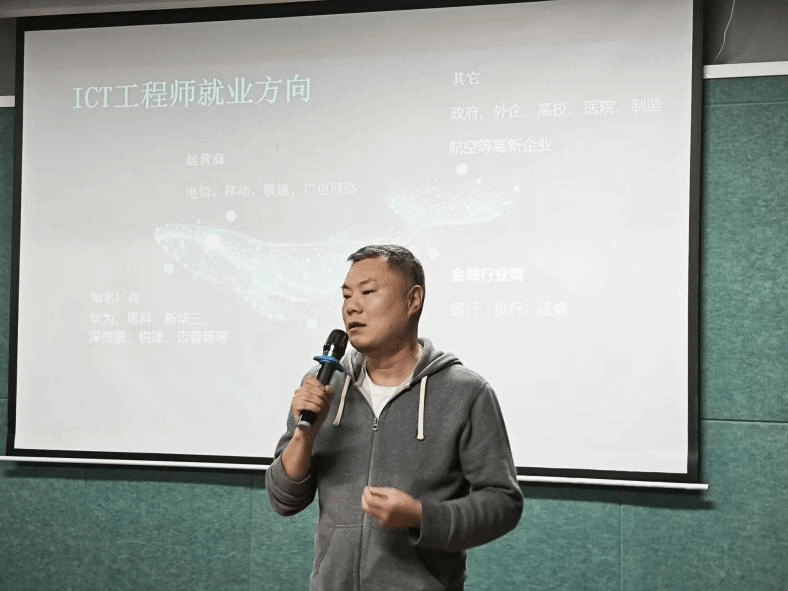 王老师从事通信行业多年,发表论文20余篇,指导学生在各类学科比赛中斩获佳绩,同时引进ICT生态圈企业两家,签订校企合作,为企业输送60余名优秀毕业生,连续三年获得“优秀指导教师”称号。活动期间王老师就ICT行业局势走向和发展进行深刻分析,从知名厂商到运营商,再到金融行业以及其它方向,为同学们将来的就业和创业积累了宝贵的经验。与此同时王老师详细介绍了通信专业相关比赛信息,并鼓励学生通过以赛促学的方式积极参加学科竞赛,领悟“做中学”的奥妙。