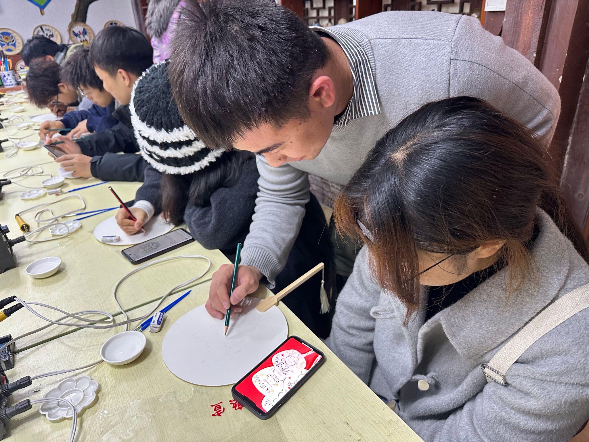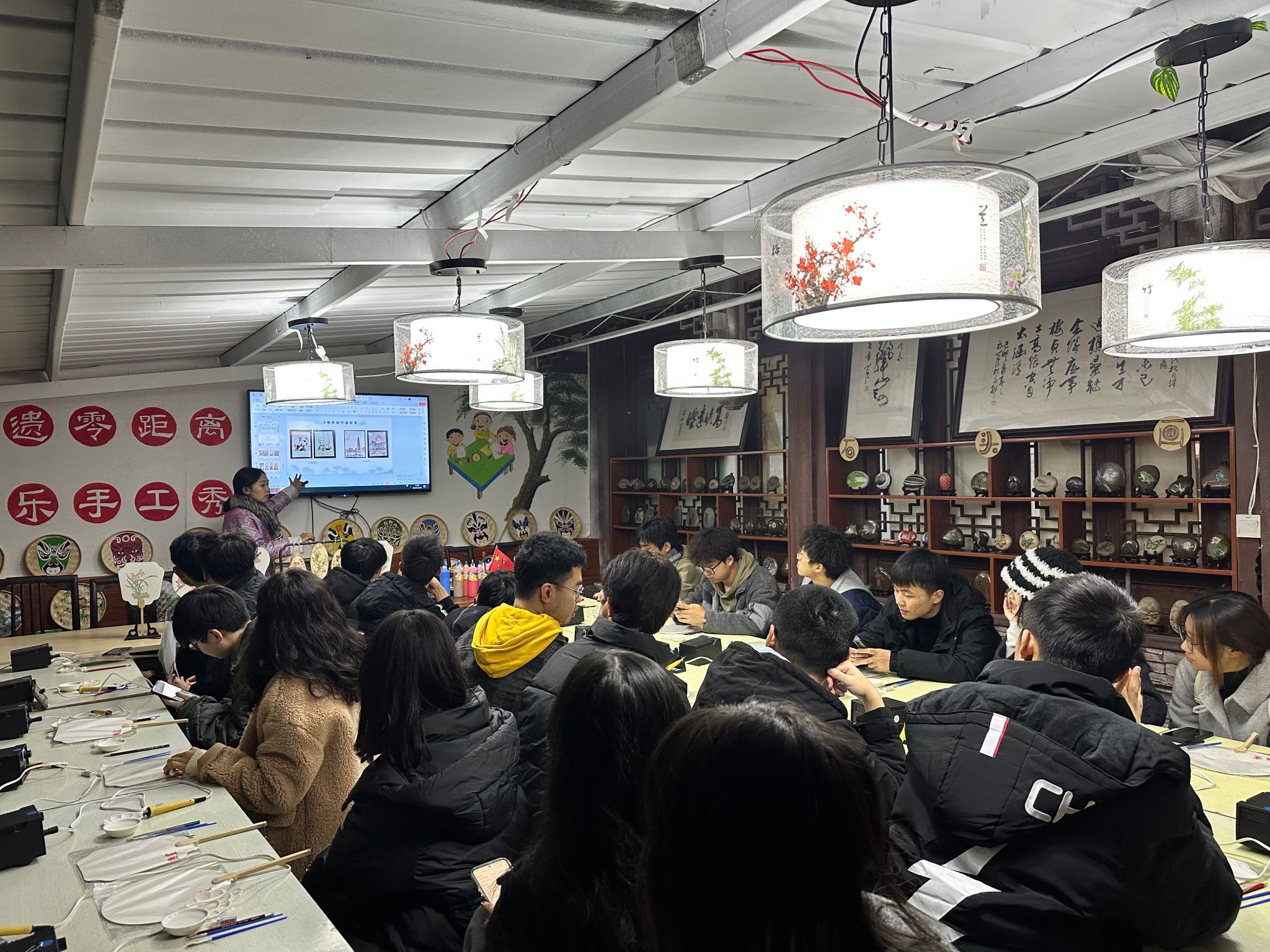 随后,于2023年11月10日,《生活中的数学思维》课程团队带领课程的学生们亲临合川峡砚博物馆,展开了一场别开生面的课程活动实践。通过非遗项目烙铁画的亲身体验,学生们将数学思维与艺术创作相结合,进行了富有创意的作品创作,通过燃烧形成的树杈状图案诠释了分形图形独特的美。一条条线分割了圆扇整个平面,实现以数学划分思维为主的平面镶嵌作品,经过填色构成一幅幅精美的画作。