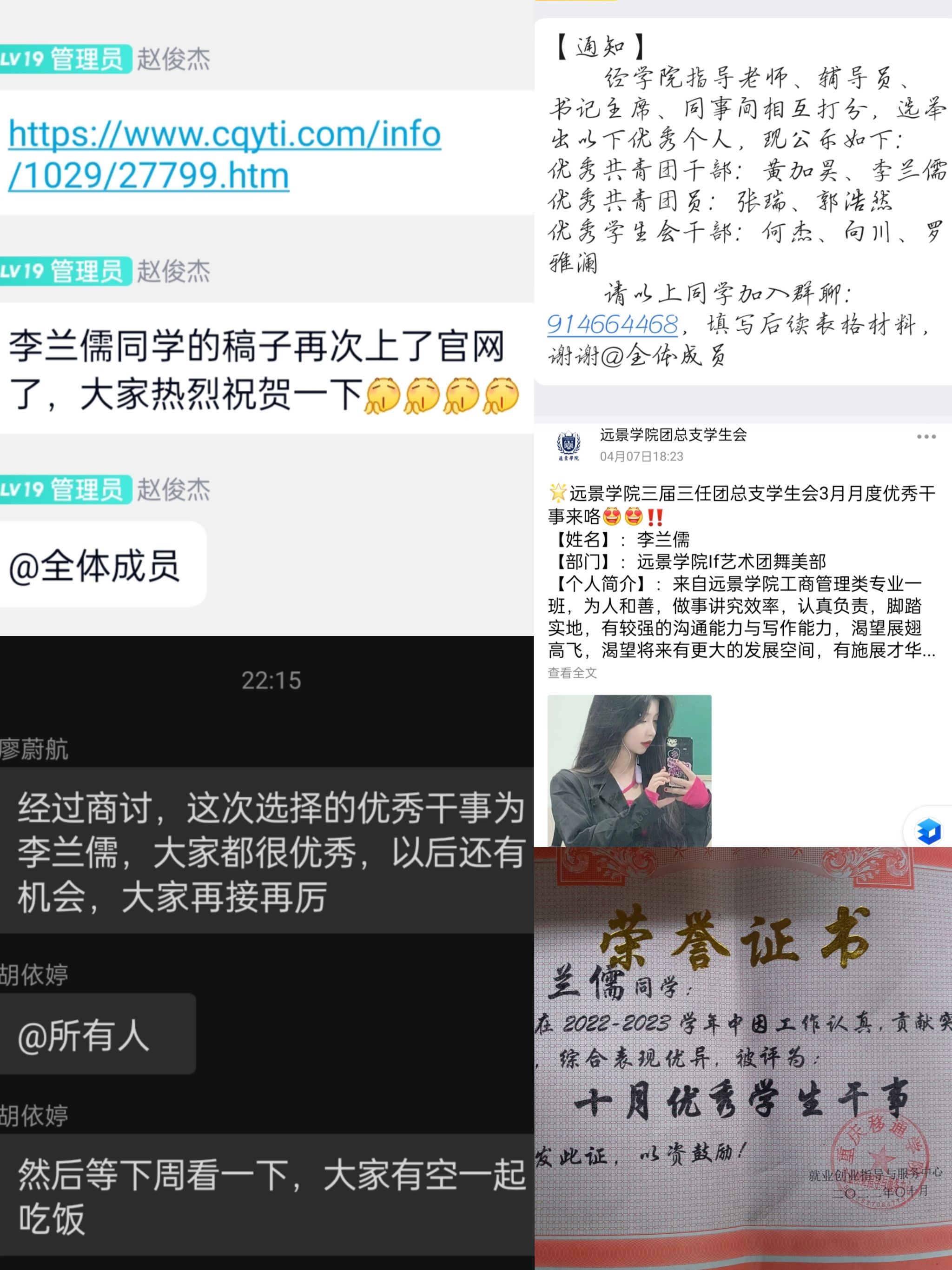 第一次担任干部,第一次参与班委工作,第一次统筹全局,这些全新的体验让我倍感压力。学业压力让我焦虑不安,工作失误也让我自责不已。作为班委成员,我与同学导员们共同努力,最终带领支部斩获了重庆市先进班集体、特色超级完满团支部、五四红旗团支部等荣誉称号,但这背后凝聚着无数次加班加点的汗水与辛劳。
