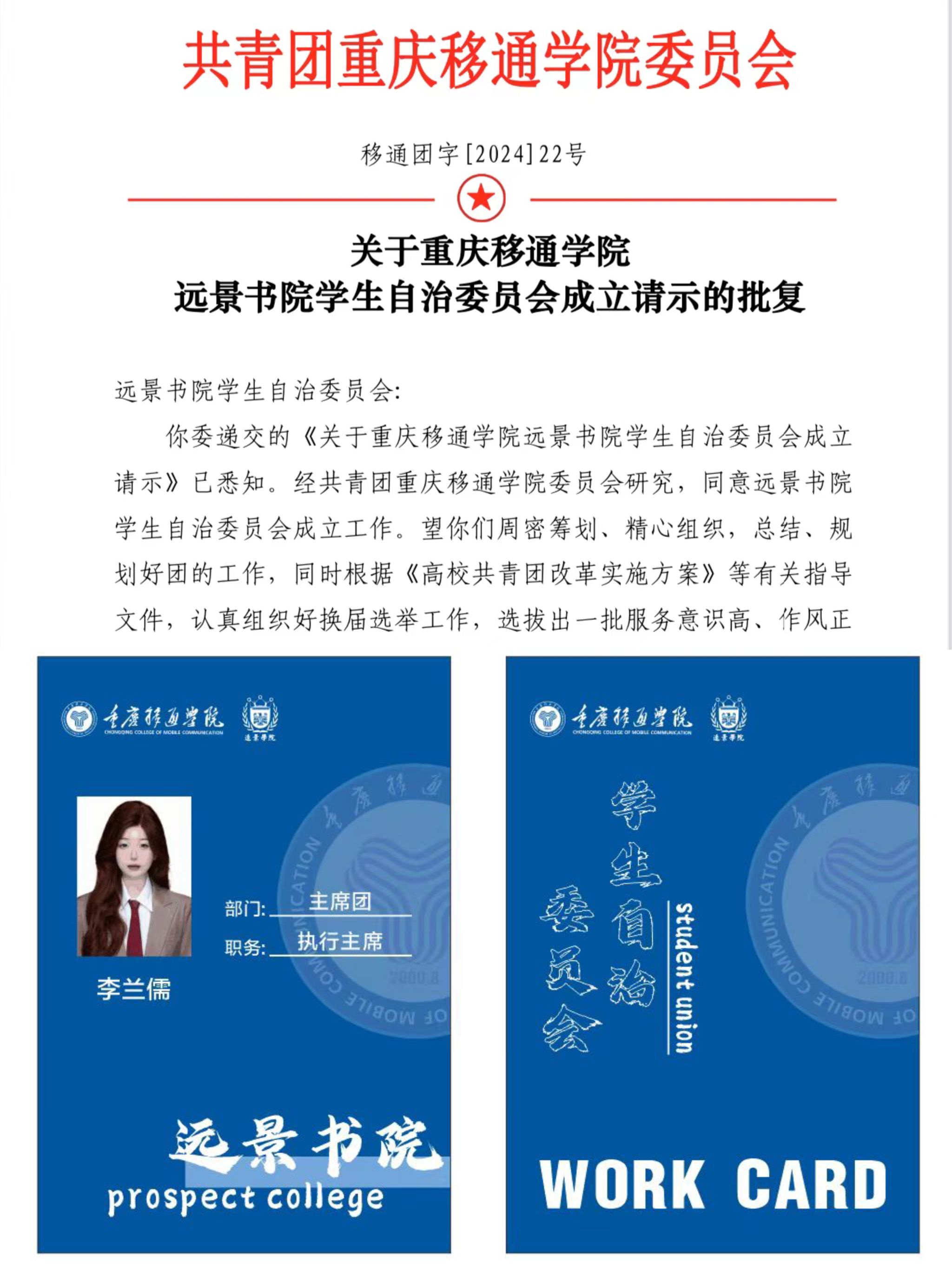 李兰儒,2022级财务管理专业,现任一届一任远景书院学生自治委员会主席,远景学院2022级02团支部团支书,重庆移通学院品牌营销与宣传新闻中心学生助理,双体第28期项目部学员。获校三好学生,校二等奖学金,优秀共青团干部,校先进个人等荣誉称号,在各项竞赛中累计收获国家级奖项5项,省市级奖项6项,校院级奖项18项;参与三校四区学生干部交流3次,一次性通过大学生英语四级、普通话水平测试,荣获中国营销策划师资格证书,拥有两次大厂实习经历。远山成景,交相辉映,我在菩提树下续写春诗,去更远的地方见更亮的光。