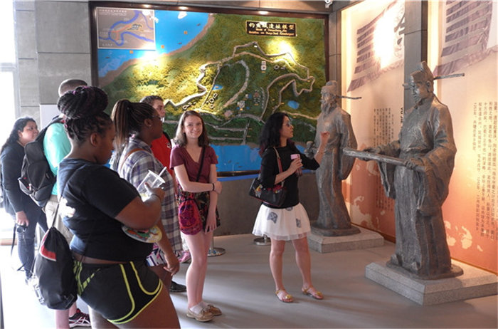 一边还在回味古琴课的魅力,一边又到了新的场所——钓鱼城博物馆。在讲解员并不十分流利的英语讲解中,NIU同学们大致了解了钓鱼城为什么称作“钓鱼城”、为什么称钓鱼城为“上帝折鞭处”、为什么钓鱼城在那么多年的战乱中始终被攻克不下等一系列问题以及钓鱼城在中国历史上的重要地位。同学们也拿出相机忙着一个一个的和雕塑人物合影留念,我想这可能是NIU同学第一次这么近这么真实的感受古代中国人物形象,同学们还在钓鱼城演播厅颇有兴致的观看了我校学生编排的戏剧《钓鱼城之熊耳夫人》等,对中国古文化再度进行了了解,极大的激发了同学们对钓鱼城的兴趣,我想大家一定非常期待明天实地感受 钓鱼城之旅吧。