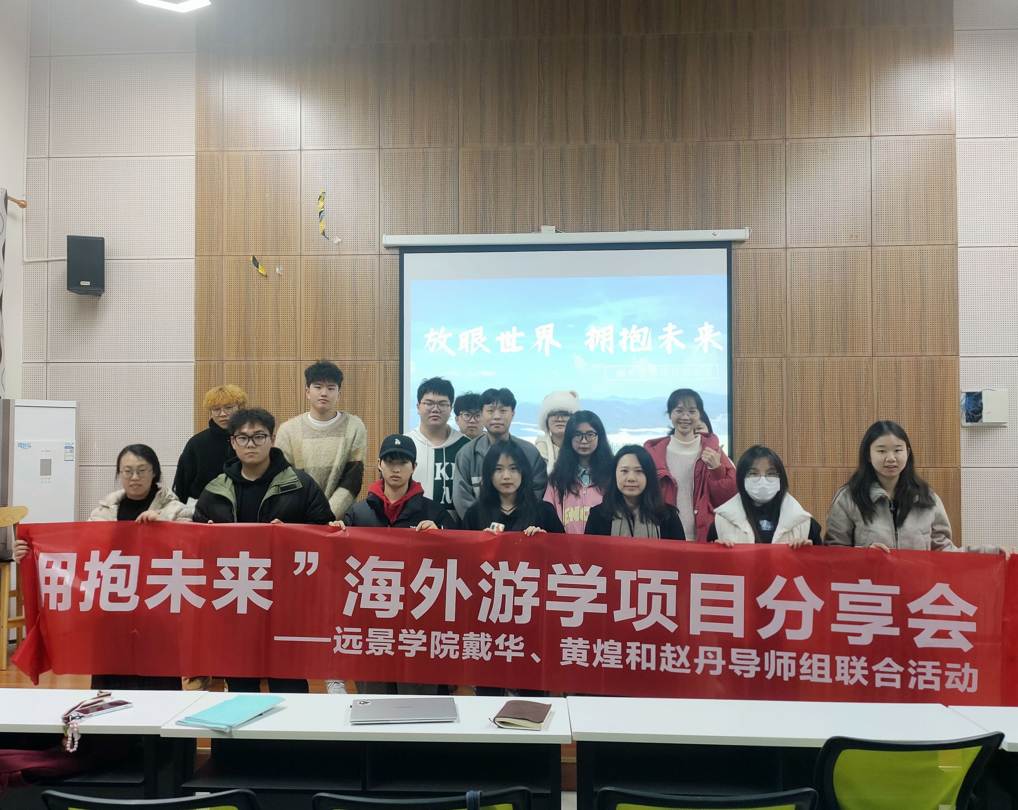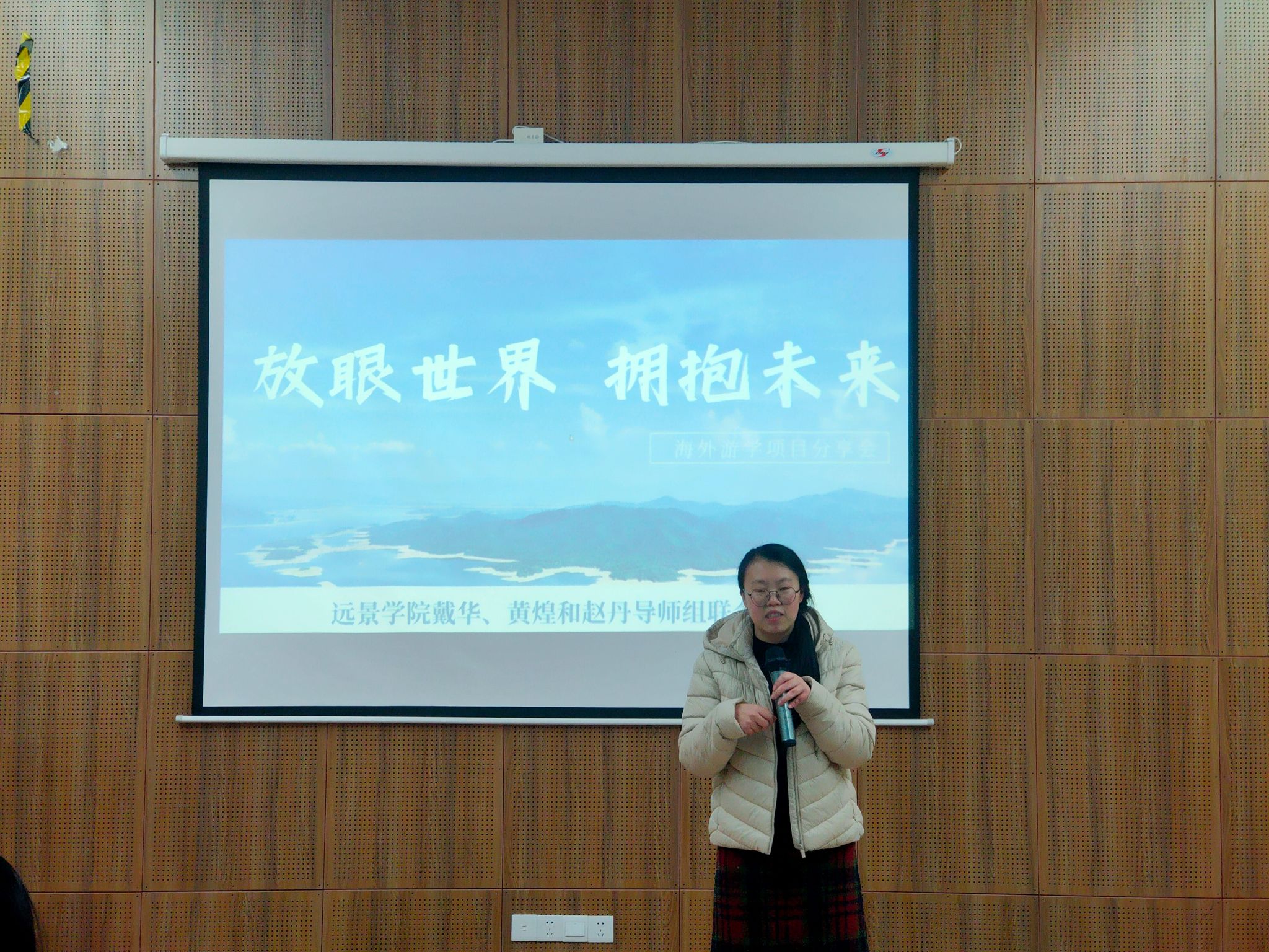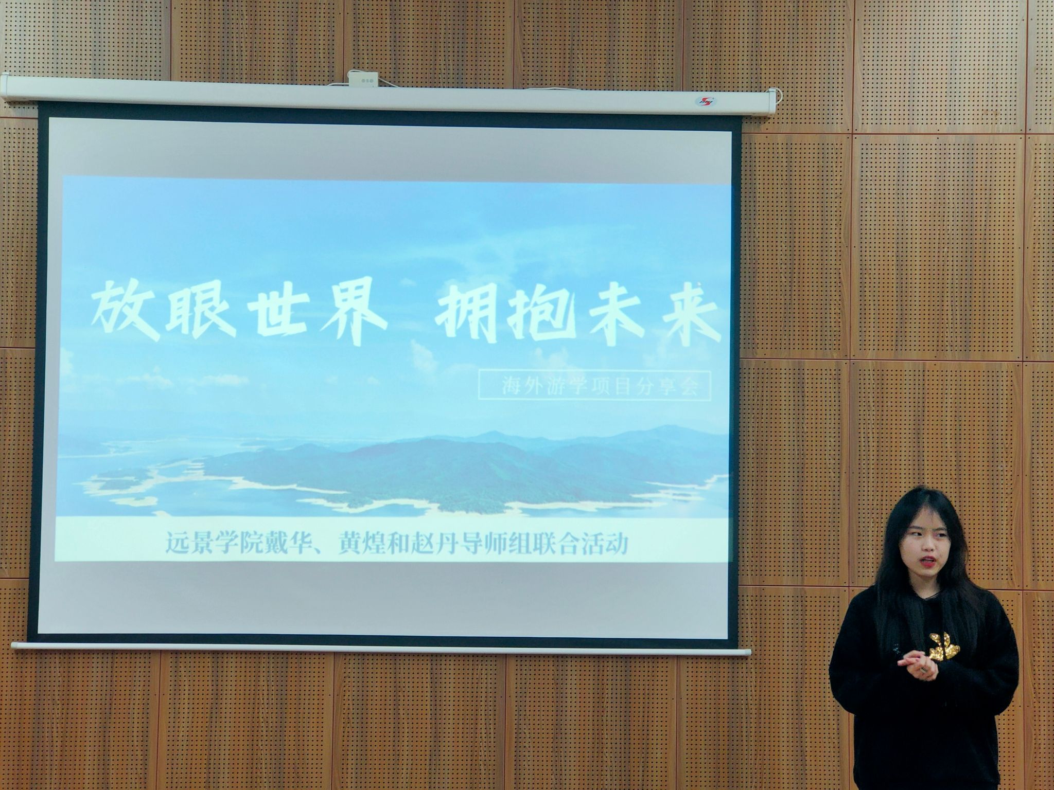 为有效推进本次游学项目,让同学们更了解海外游学项目的相关细节,营造国际化师生交流氛围,2023年11月30日晚,远景学院黄煌、戴华和赵丹三位老师组织导师组成员于天渠书院111报告厅开展以“放眼世界,拥抱未来”为主题的海外游学项目分享会。本次会议由黄煌老师进行主持,并邀请到远景学院三位有丰富经历的学长学姐进行分享。