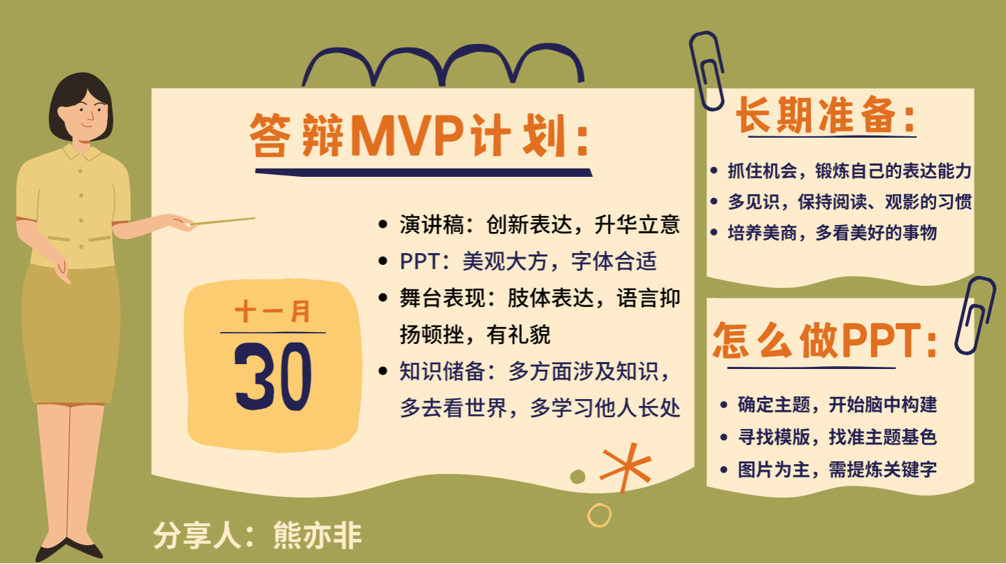 活动伊始,熊亦非学姐结合自身新加坡游学答辩的经历,从答辩MVP计划、长期准备、怎么做PPT三个方面展开分享。她强调,答辩的演讲稿需要创新表达,注意升华立意。其次,PPT要美观大方,提炼关键词,以图片为主;在答辩时需要语言抑扬顿挫,适当结合的肢体表达使形象自信大方。学姐还特别强调在大学生活中要多阅读观影和看世界,培养公民意识,拓宽自己的国际视野,成为一个全面发展的人。