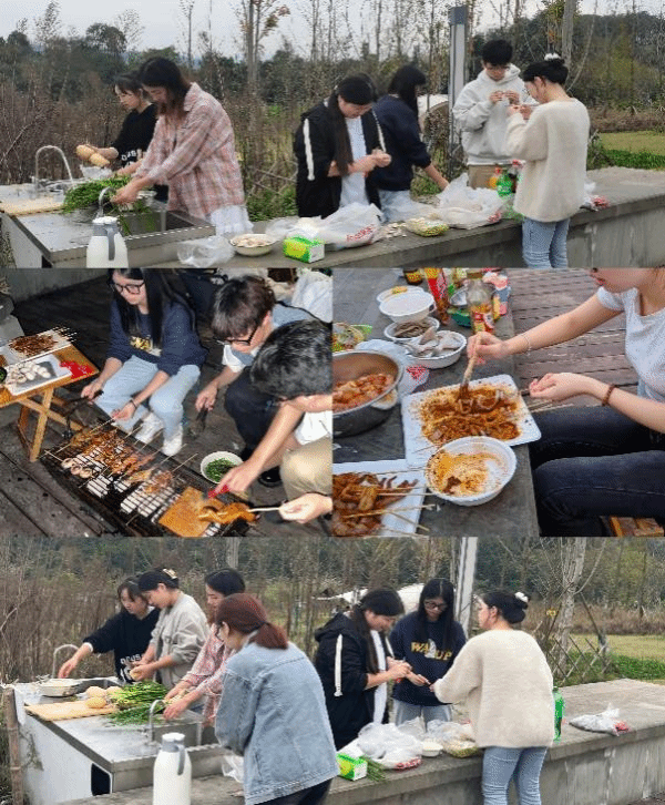 导师组同学分工合作,黄煌老师携部分同学前往超市挑选新鲜食材和佐料,剩余同学在草坪上布置场地。在食材准备环节大家各司其职,剥蒜、洗菜、切菜、串签.....来自不同年级的同学相互交流学习,分享学长学姐分享自己的学习经验和完满活动趣闻,随着火锅的沸腾和烧烤的香气弥漫,大家的情感也随着沸腾,山野间回荡着欢声笑语。