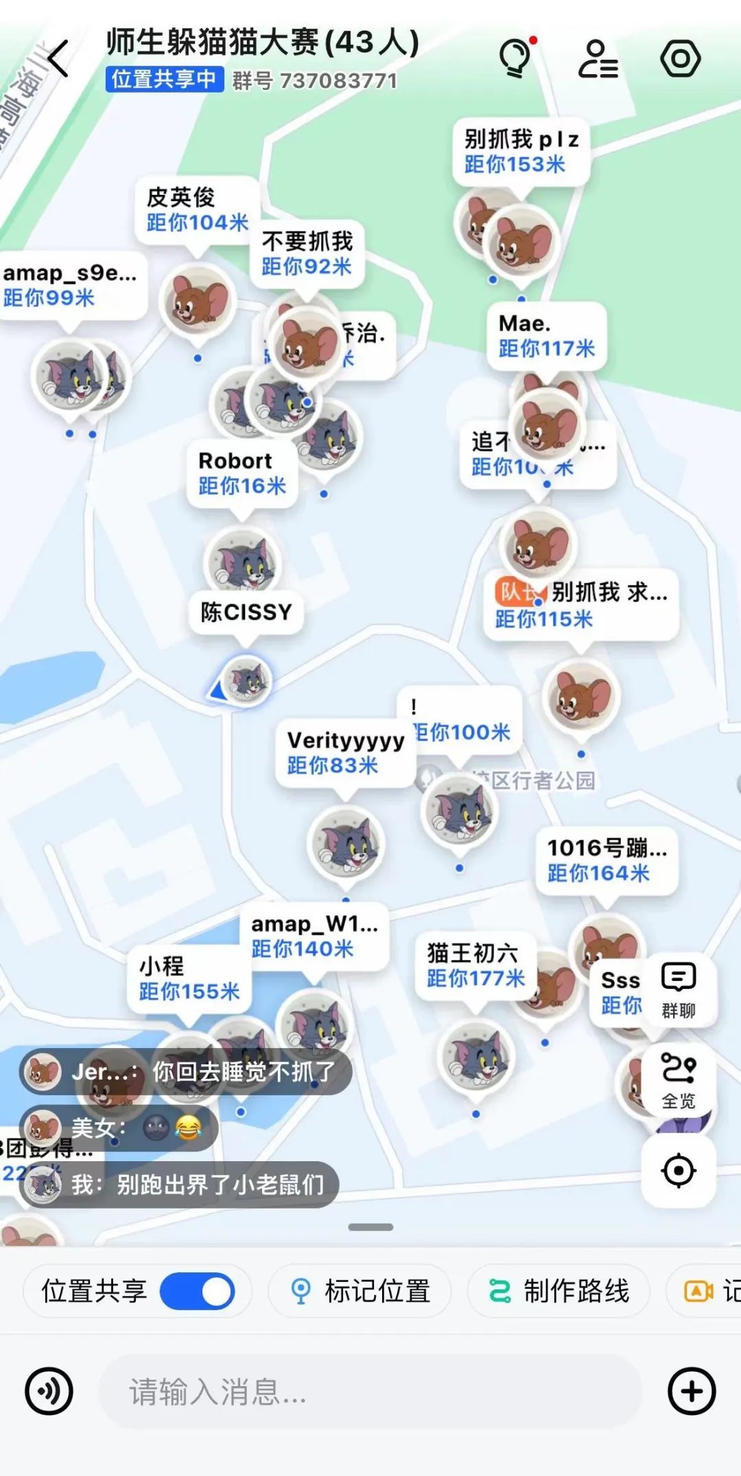 全体玩家在高德地图上更换角色头像,共享位置。而为丰富游戏的趣味性,三位导师主动在开局担任了Tom猫的角色。同学们手腕上戴好游戏手环,系紧了鞋带,正式开启了本次活动的篇章。