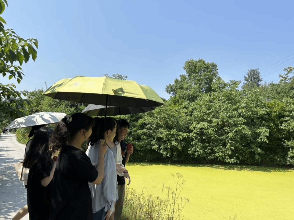原始瀑布风景区往往保留着形成时的纯粹地貌,让人沉醉,而从林间徒步至瀑布的景色同样让人震撼。从车站出发到达目的地后,一行人沿着田地溪流行进,走在山间小道上,能够感受到清新的空气和轻松的步伐,还在沿途中遇到了一大片浮藻,陈思含老师为大家科普了有关于浮藻及其环保的知识,介绍了浮藻并简述了它在保护生态,改善环境中的两重作用,以及简介了有关浮藻治理的进展。老师的讲解引起了大家对浮藻的了解和兴趣,同学们纷纷向老师提问,大家讨论的不亦乐乎。