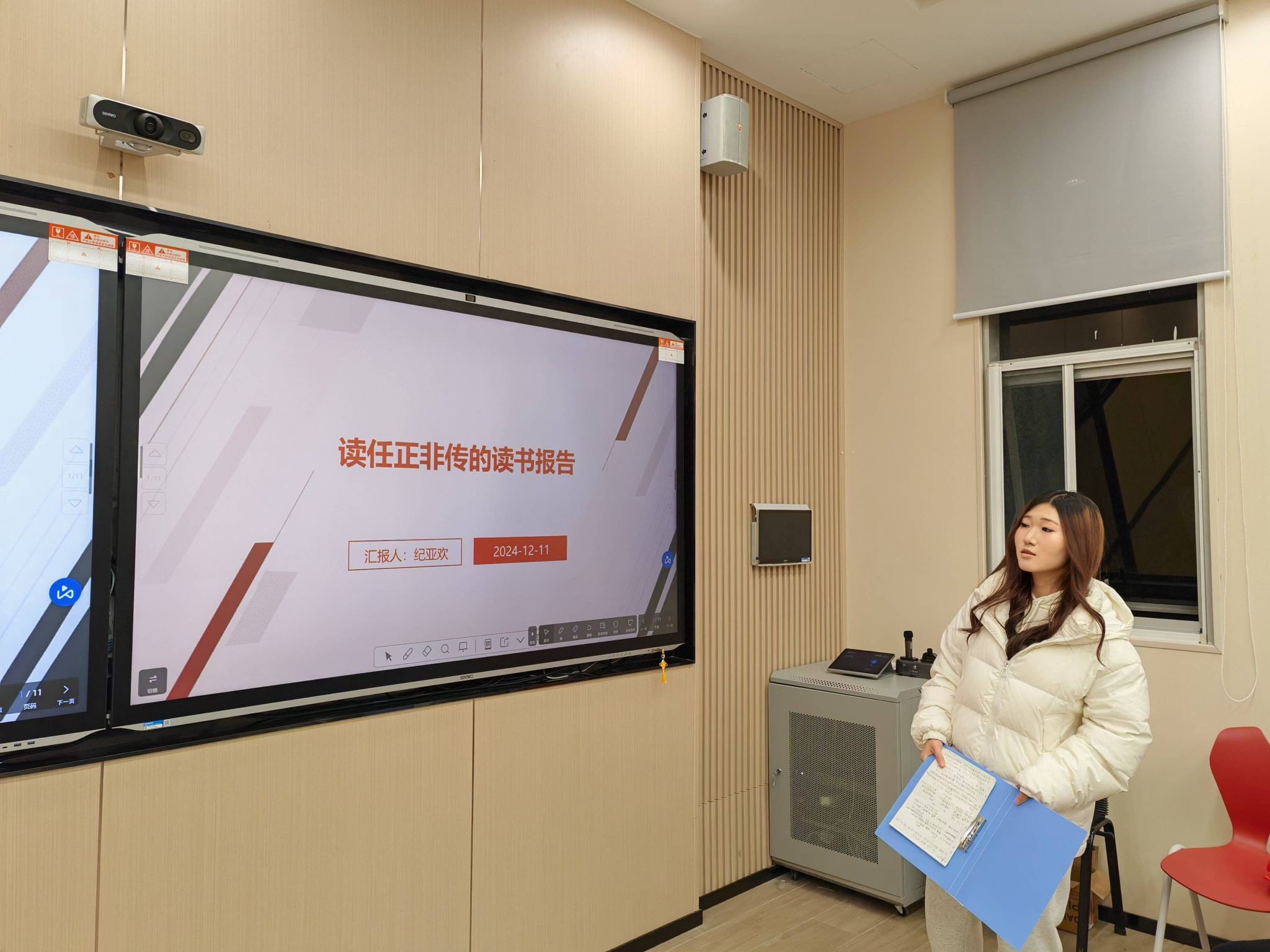 在读书分享会上,纪亚欢同学率先分享了《任正非传》。纪亚欢同学分别从“担当”、“团队”和“自我批评”三个方面分享了读《任正非传》的感悟心得。纪亚欢同学提出在担当方面,任正非以身作则,勇于承担企业责任,面对困难时从不退缩,这种担当精神激励着华为不断前行。团队精神上,他强调集体智慧,倡导员工间相互协作,共同为公司目标努力,这种精神让华为在激烈的市场竞争中保持了强大的凝聚力。在自我批评方面,任正非倡导开放的企业文化,鼓励员工进行自我反思和批评,以促进个人和组织的成长。这三个核心理念,不仅塑造了华为的企业文化,也为其他企业提供了宝贵的管理经验。