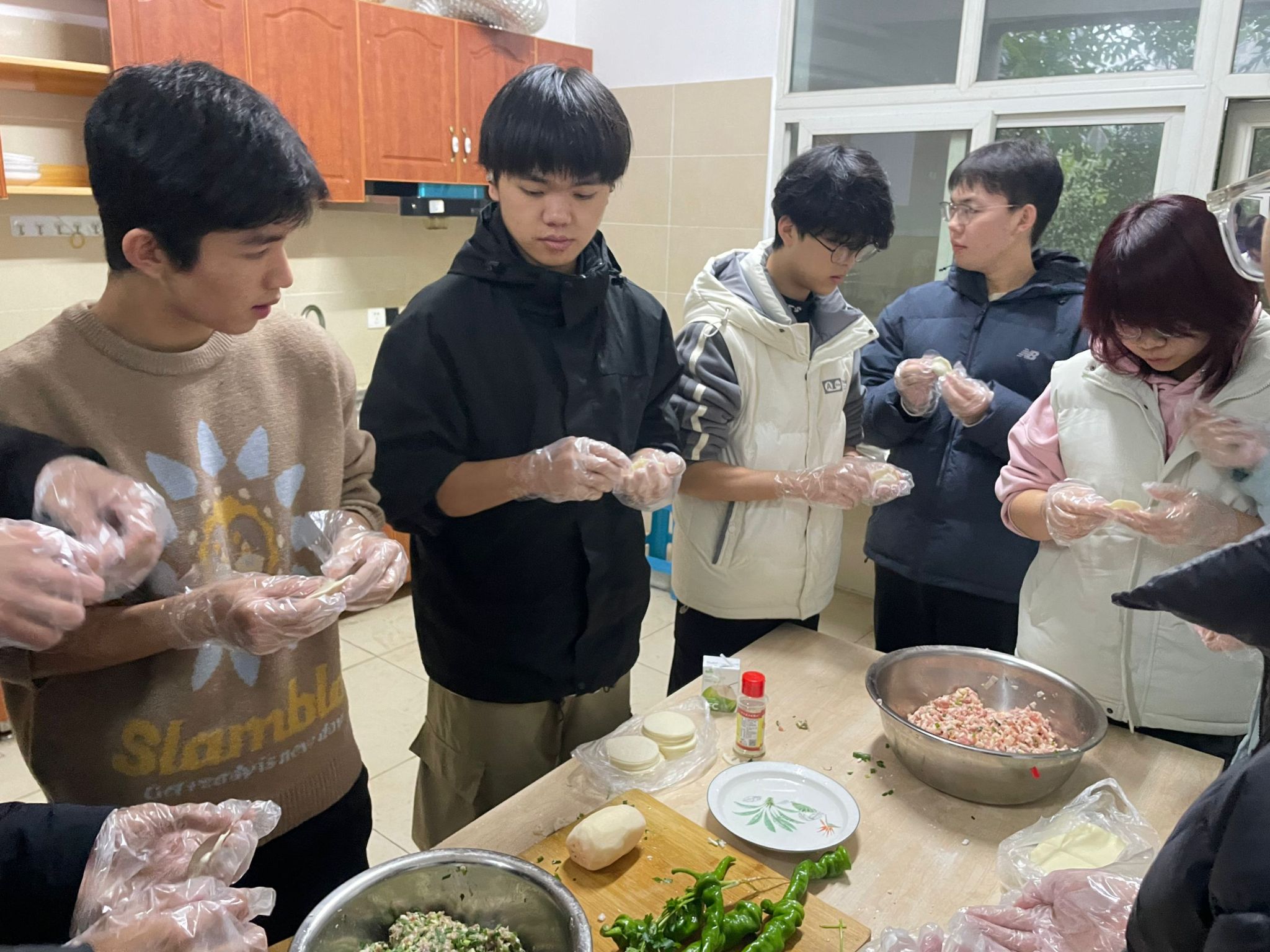 包饺子环节更是热闹非凡。同学们脑洞大开,发挥创意,包出了形态各异的饺子。有的鼓鼓囊囊,宛如金元宝,寓意着财源广进,寄托着对未来美好生活的向往;有的花边精致,宛如艺术品,展现着同学们的巧手与匠心。在包饺子的过程中,同学们相互打趣、交流家乡包饺子的习俗,从北方的厚皮大馅到南方的细腻小巧,从各种独特的调料搭配到包制时的独特手法,来自天南海北的文化在这里碰撞出了奇妙的火花。
