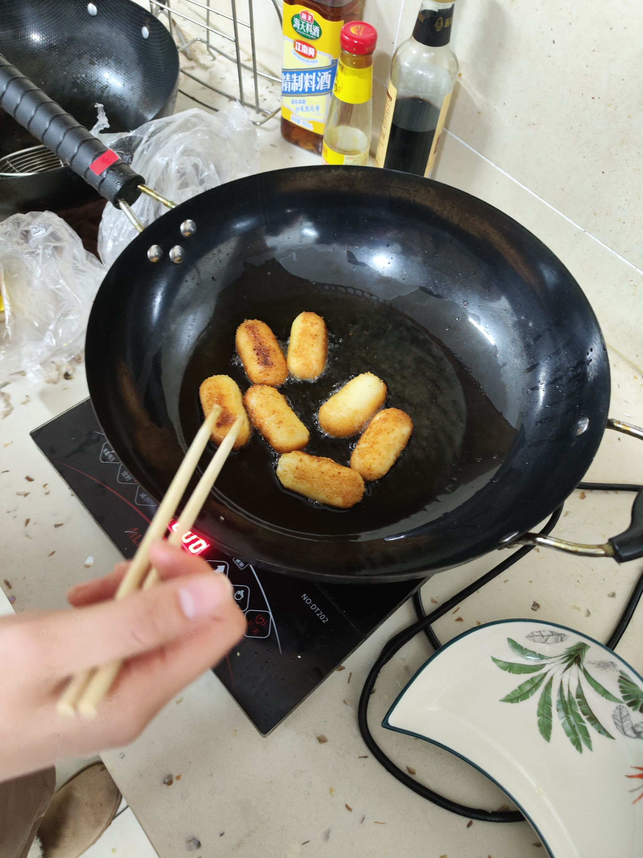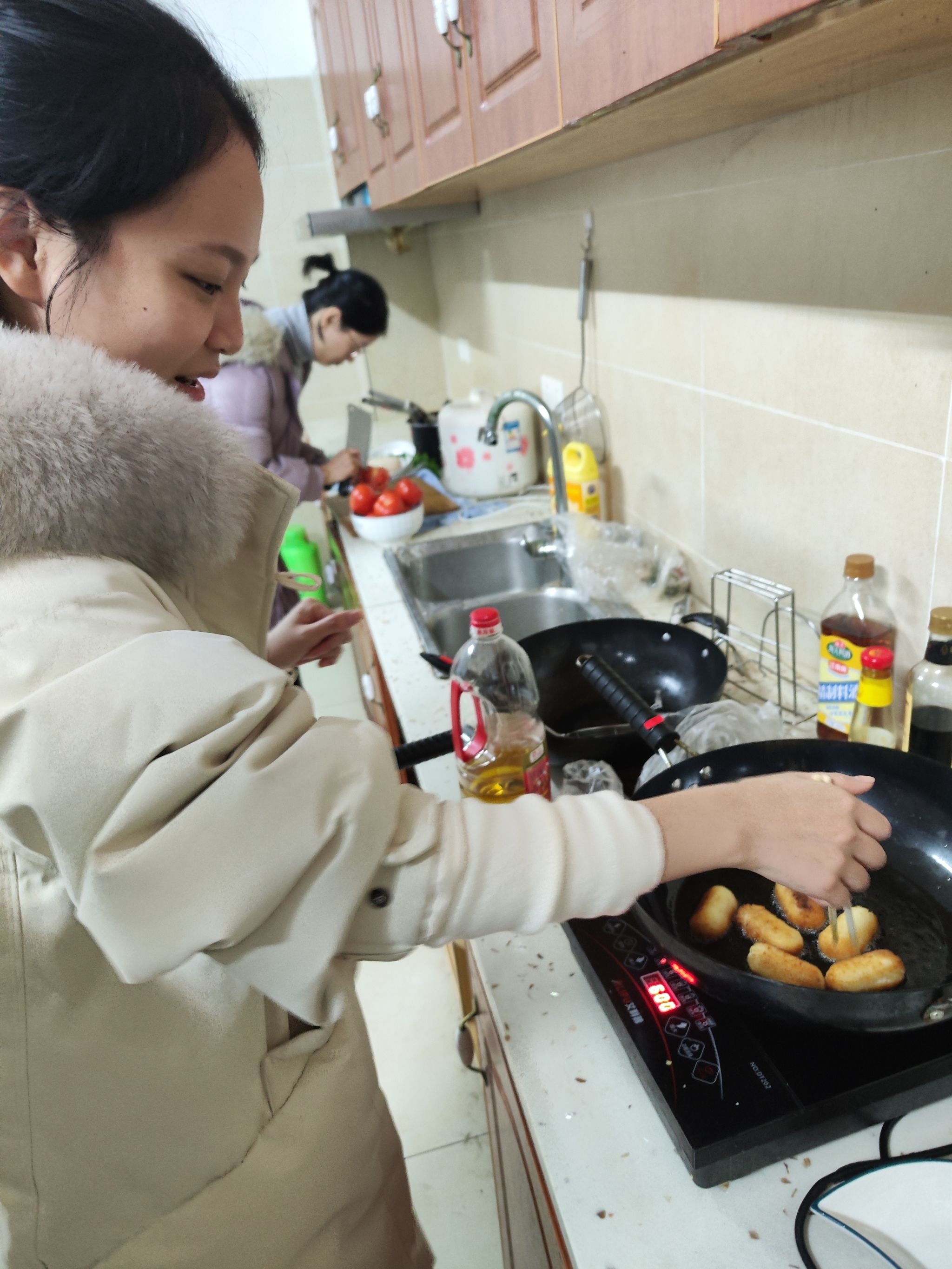 此次活动旨在暂时放下繁忙的学习与工作,通过共同制作美食来拉近师生间的距离。老师们率先垂范,手法娴熟地处理食材,洗菜、做红糖糍粑、包饺子,每一个环节都充满了欢声笑语。红糖糍粑作为开胃菜,以其软糯Q弹、甜而不腻的口感赢得了众人的喜爱。当冰凉凉的糍粑倒入热油锅时,香甜气息瞬间弥漫开来,大家都迫不及待的想要品尝。尽管有少数同学因操作不慎将糍粑做成了“红糖锅巴”,但这也成为了现场的一大笑点,让气氛更加火热。
