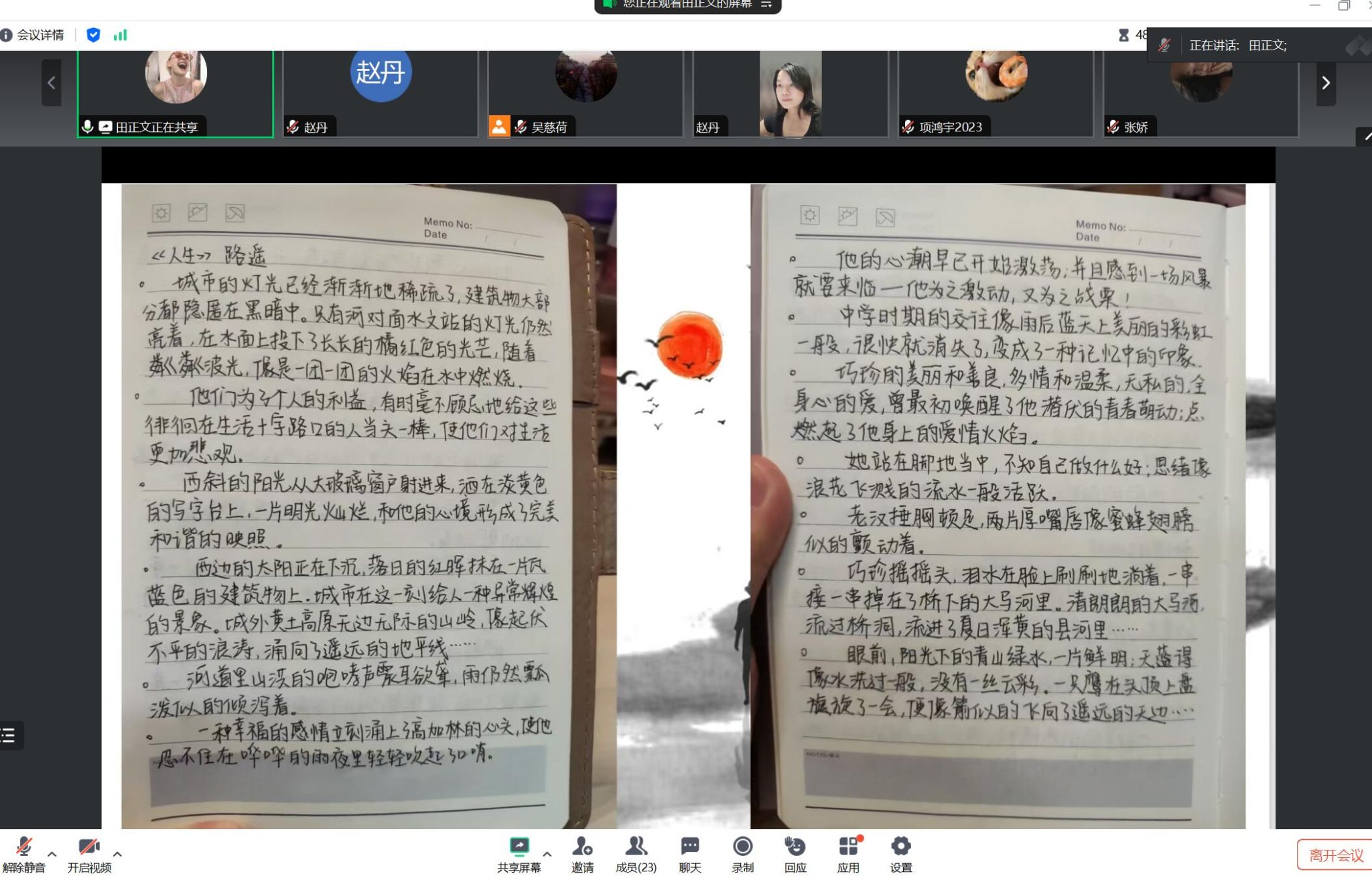 来自赵丹老师导师组的田正文同学则带来了路遥的中篇小说《人生》。本书通过描述主人公高加林在陕北高原上的奋斗与挫折,以及他与刘巧珍和黄亚萍之间的纠葛,展现了一个年轻人在理想与现实碰撞中的抉择和成长。田同学向我们展示了当时社会的复杂性和农村青年的困境,展现出路遥对时代与人性的深刻洞察,并分享了她的手写笔记。