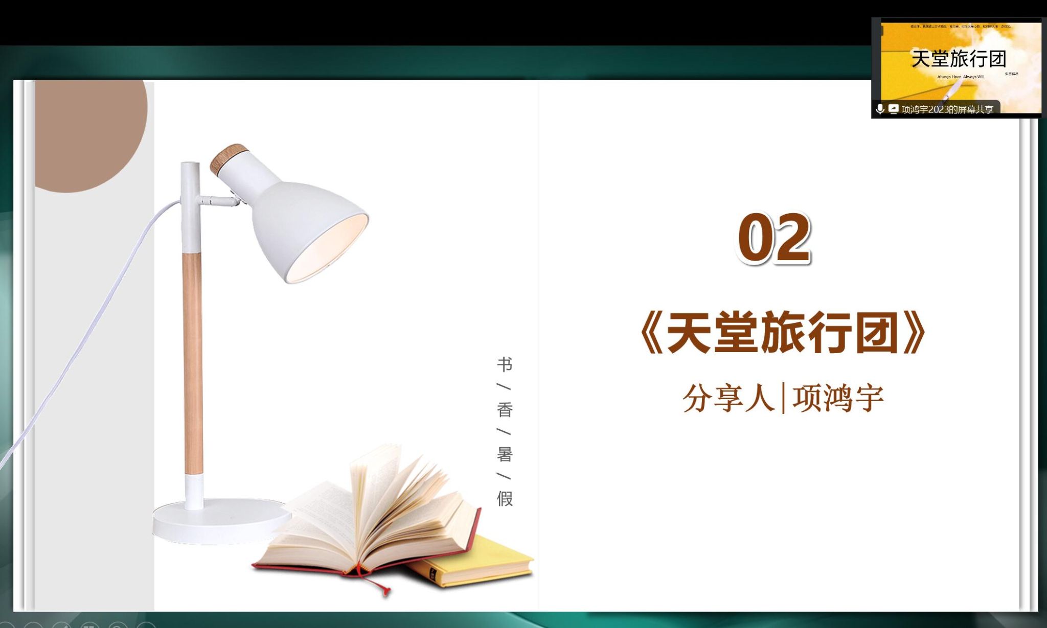 第一位分享者的是郭杨老师导师组的项鸿宇同学。他带来了张嘉译的小说《天堂旅行团》。项同学讲述了小说主人公宋一鲤在生活重重打击下,如何意外地踏上了一场探索生命意义和寻求心灵救赎的旅程。在这次旅行中,他与一个患癌症的小女孩小聚相遇,她的纯真和勇气让宋一鲤对生活有了新的认识,也让他重新获得了前进的动力。小说中充满了许多触动人心的格言,如“请赐予我平静,去接受我无法改变的。请赐予我勇气,去改变我能改变的”和“我慢慢明白,人与人之间没有突然,她想好了才会来,想清了才会走”。通过项同学的分享,同学们对人生逆境中的态度有了更深刻地思考。