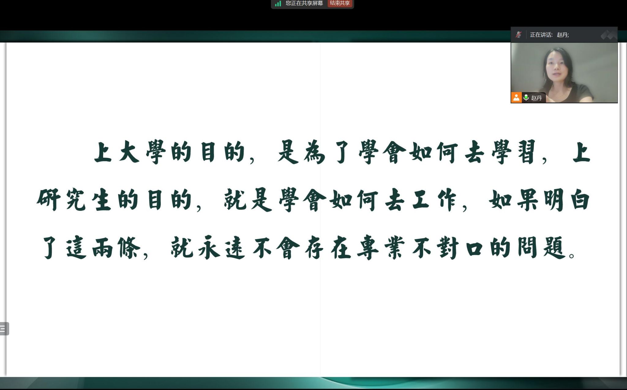 活动伊始,主持人赵丹老师介绍了活动流程,并结合学院的大咖传记阅读以《雷军传》的部分内容做开场。“上大学的目的,是为了学会如何去学习,上研究生的目的,就是学会如何去工作,如果明白了这两条,就永远不会存在专业不对口的问题”,赵老师希望同学们能对大学学习有更深刻的认识,教育的本质是培养学习能力和解决问题的能力,而非仅仅传授知识,培养可迁移能力远远大于具体知识的获得。
