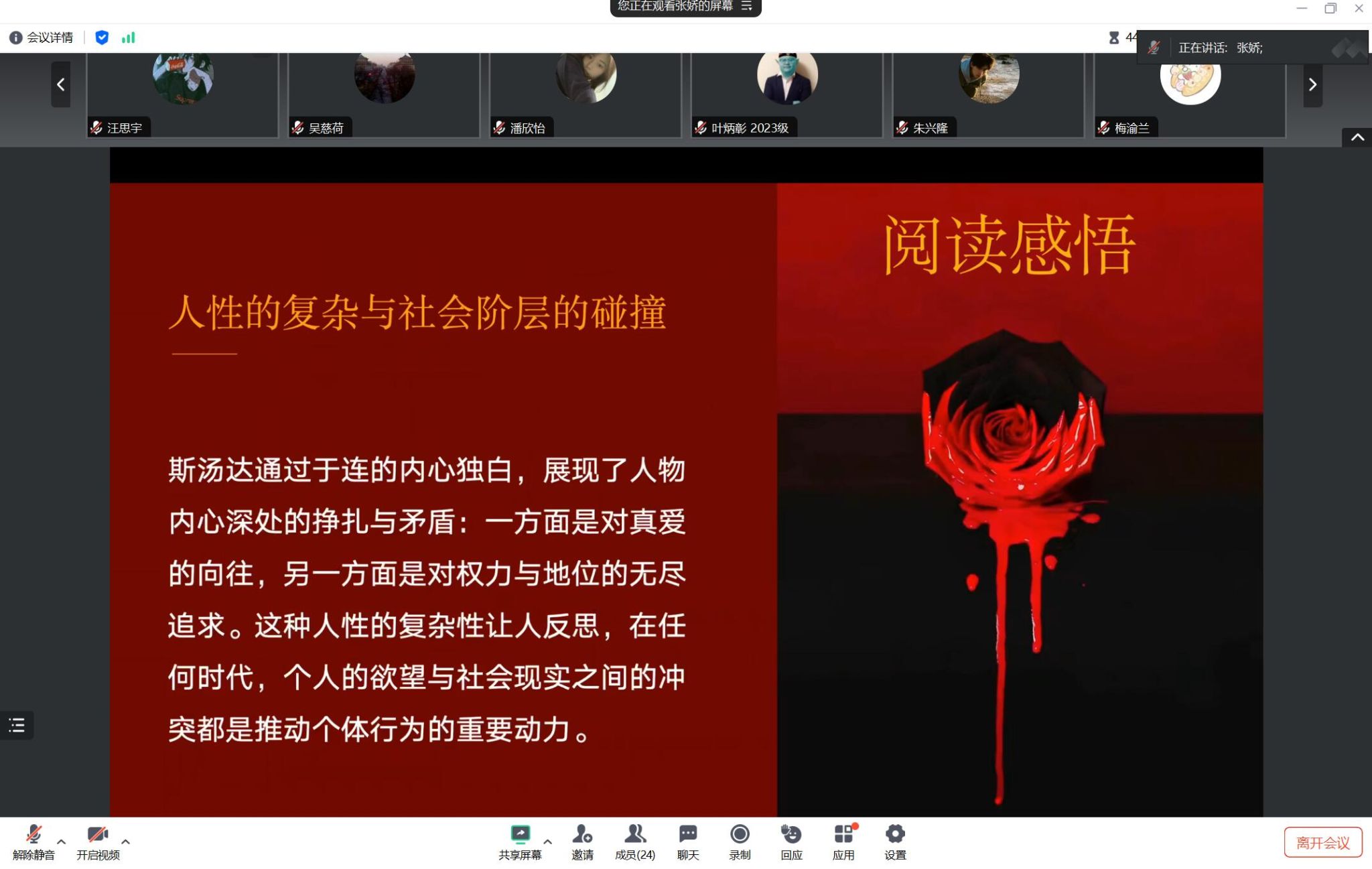 紧随其后,来自鲁明宙老师导师组的张娇同学分享了经典读本《红与黑》。司汤达的这部作品讲述了在19世纪法国社会背景下,主人公于连通过野心和爱情在社会阶层间攀升,最终因情感和道德的冲突而走向毁灭的悲剧。通过张娇同学的分享,大家对新旧时代交替下19世纪初的法国社会有了更深的认识与理解——“我从地狱来,要到天堂去,正路过人间”。