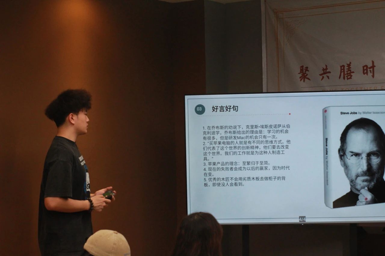 紧随其后,来自2023级的宋泽宣同学分享了大咖阅读-沃尔特·艾萨克森的《乔布斯传》。通过书中乔布斯及其家人的亲口叙述,宋同学深入揭示了这位科技巨匠的人生轨迹和创造哲学,展现了一个多面而真实的乔布斯形象,让在场师生对这位传奇人物有了更为全面的理解。