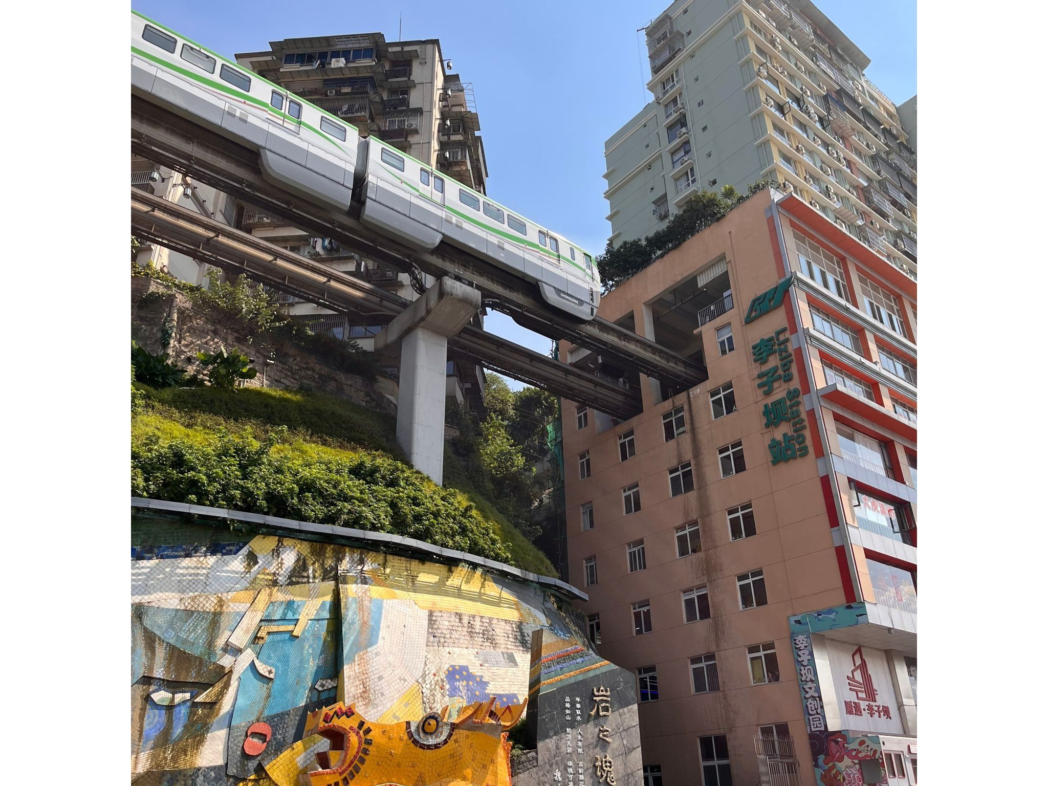下午时分,导师和学生们乘坐轻轨来到了徒步的起点——李子坝轻轨站。这里不仅是重庆的网红打卡地,更是见证了重庆人民如何巧妙地利用自然地形,将轻轨穿楼而过的设想变为现实。这一创新不仅展现了重庆人民的智慧,更是巴渝人坚韧不拔精神的体现。