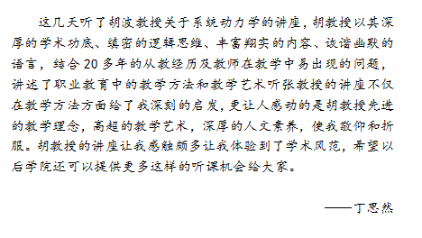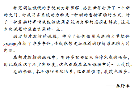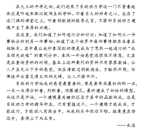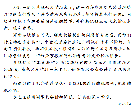 《系统动力学》是一门较为复杂的课程,需要较为综合的能力,了解方方面面的知识,并将这些知识合理地结合起来,找到其中蕴含的逻辑关系或函数关系。对于现阶段的学生来说,难免会有些吃力,胡教授总是能通过一些同学们身边所熟知的简单、基础的实例引入到动力学模型,让晦涩难懂的理论转化为浅显易懂的基础知识。虽说存在一定的难度,但丝毫不影响同学们学习的热情,上课积极发问,下课也围着老师讨论问题。胡波教授最初感觉很意外,他表示这是他第一次给国内的学生上课,没想到会有如此可喜的反应。学习过程有不少磕磕绊绊,教授也不遗余力地回应着同学们的学习热情。