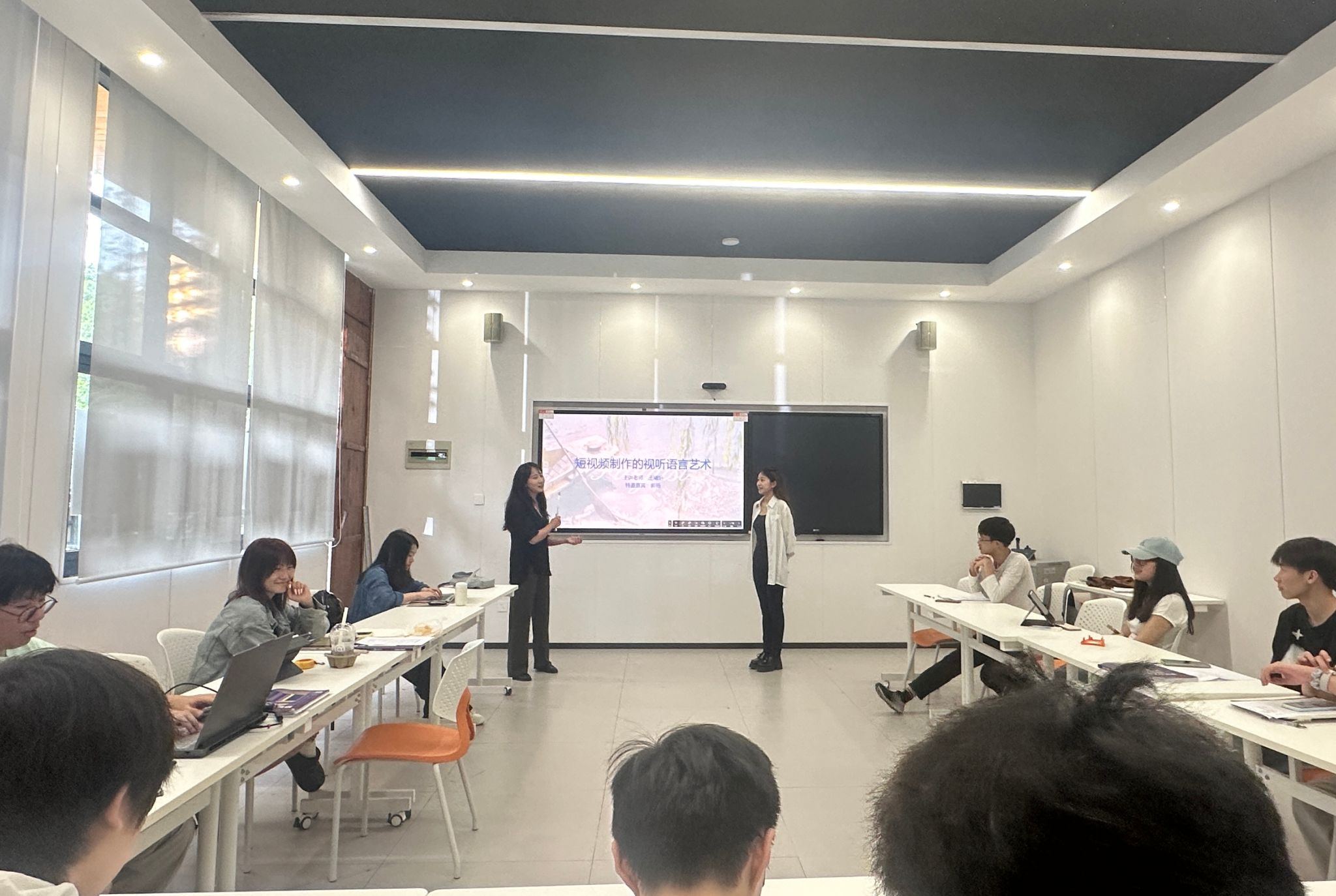 在课程的高潮环节,两位老师携手,以经典电影《闪灵》片段为蓝本,展开深度解析。她们逐帧分析镜头的运动、切换与音乐节奏、旋律的配合,揭秘导演如何通过视听语言的精妙组合,营造出令人毛骨悚然的恐怖氛围。学生们沉浸其中,跟随老师的讲解,感受视听语言协同作用的强大魅力,现场互动频繁,思维的火花不断碰撞。
