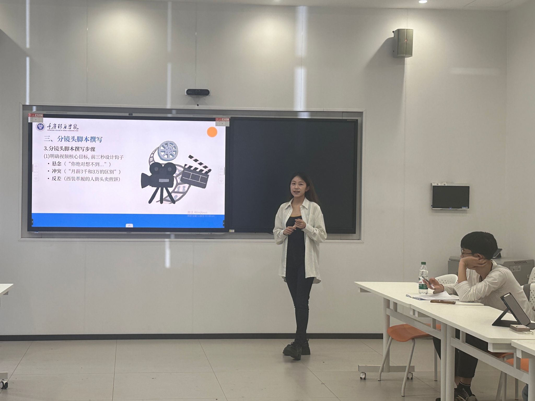 课堂伊始,王曦妍老师化身“镜头语言导师”,围绕景别、拍摄角度和转场技巧三大要素展开系统讲解。她通过拆解多部影视作品的经典片段,生动阐释了不同景别如何传递情绪、塑造人物,不同拍摄角度怎样营造独特的视觉张力,以及巧妙的转场技巧如何实现画面的自然衔接。学生们在丰富的案例展示中,对镜头语言的运用有了更直观、深刻的理解。
