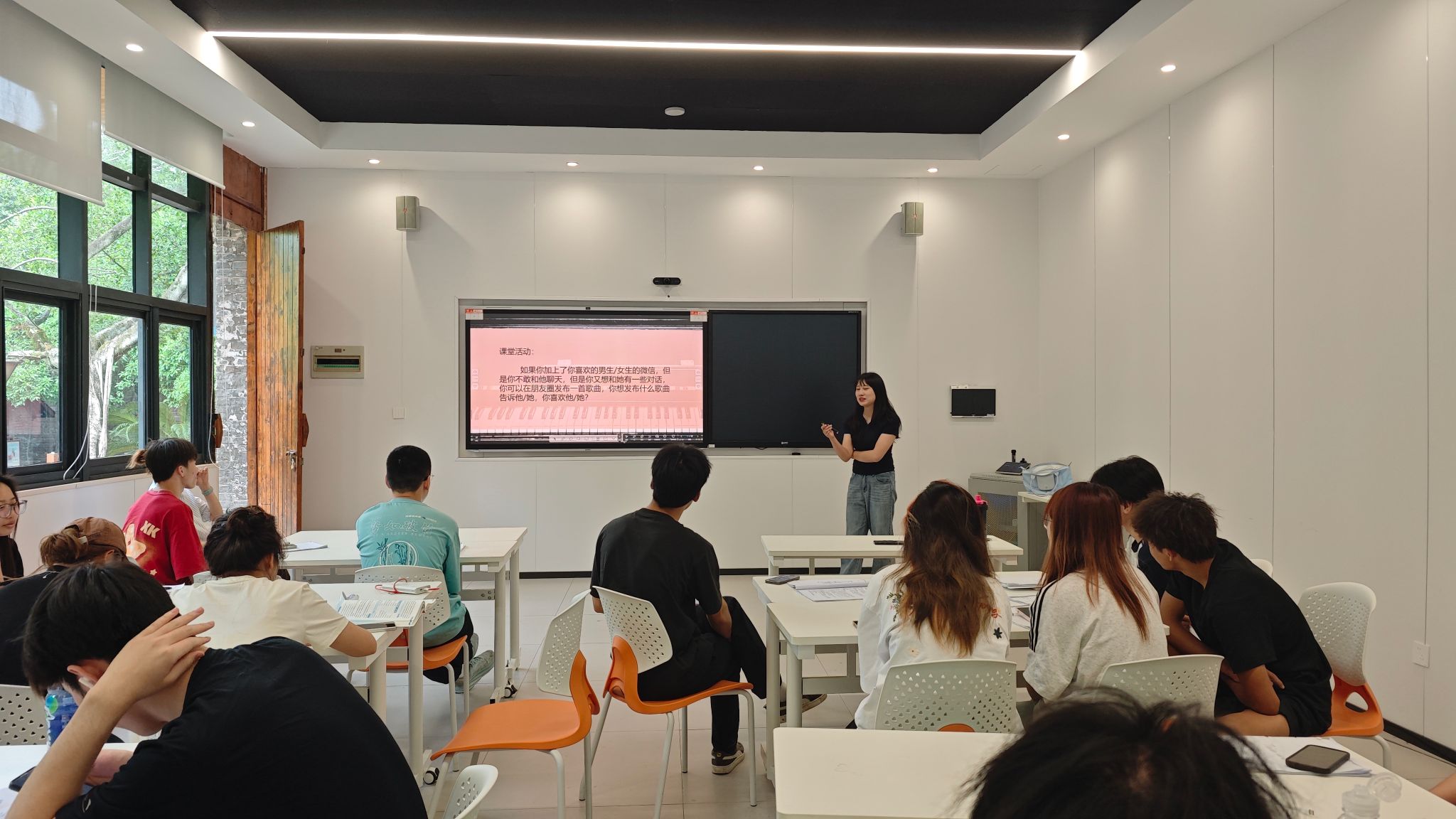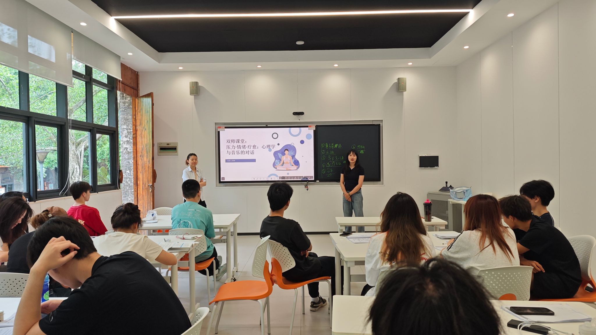 5月23日早上,在菩提电影1教室,一堂融合心理学与音乐剧的双师课堂悄然展开。《应用心理学:思想的驱动力》课程主讲教师吴昊飞,与音乐剧教师郭杨联合授课,从心理学视角解读大学生的情绪与压力,同时通过电影片段与音乐互动,探索音乐表达与调节情绪的独特力量。