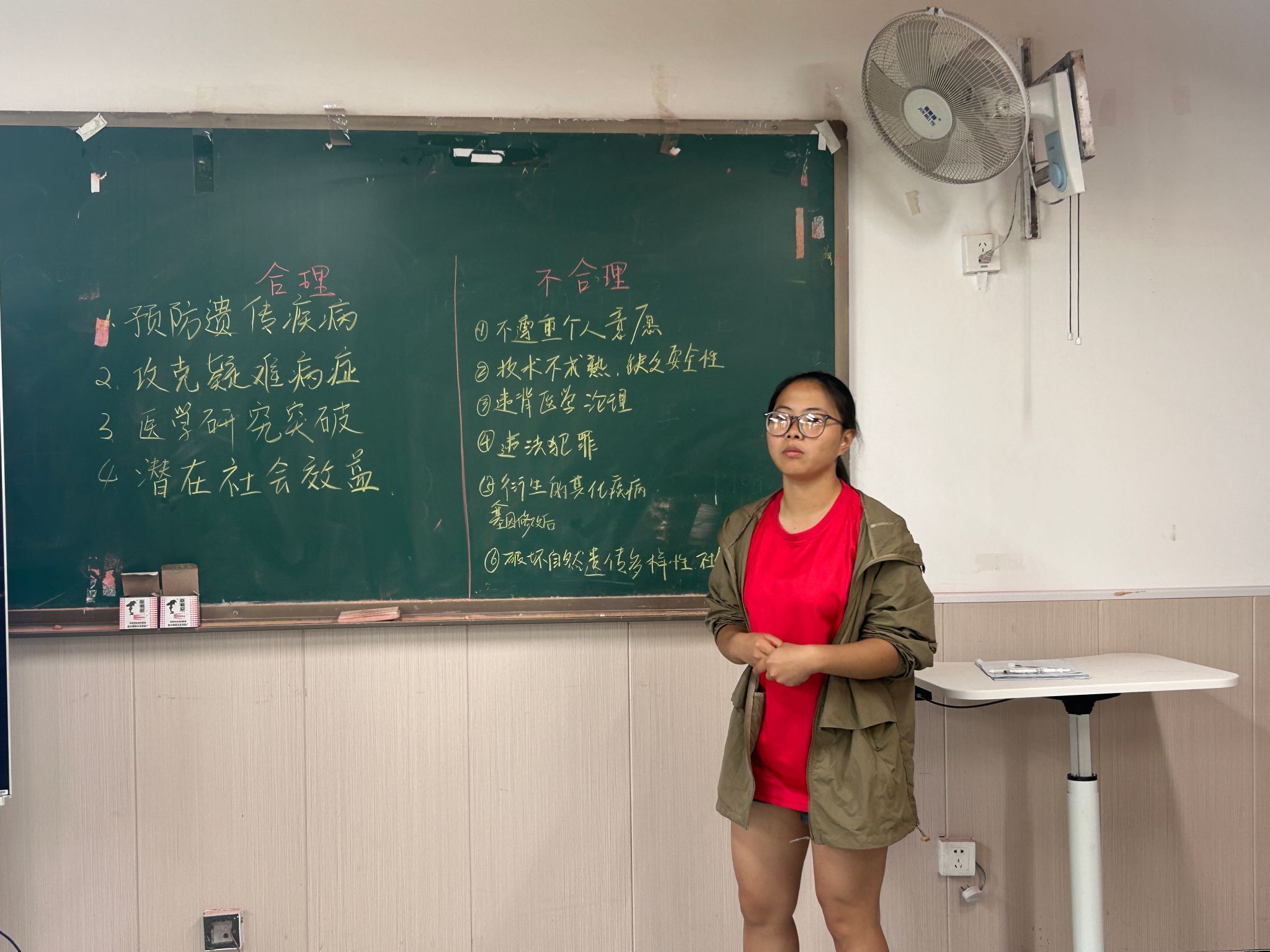 在课堂讨论环节,两位老师通过抛出2018年贺建奎基因编辑婴儿与2025年巴基斯坦艾莎基因编辑治疗两个事件,组织两组学生围绕“基因编辑应用的合理性与不合理性”展开激烈辩论。一组同学从技术普惠性出发,主张基因编辑可以为传染病、罕见病等患者提供救治希望,具有一定的医疗和社会效益;另一组同学则强调“优化基因”可能引发的社会不平等,损害人体的多样性。在辩论之中,学生们进一步加深了有关基因编辑的应用场景和法律伦理边界等相关知识的理解。